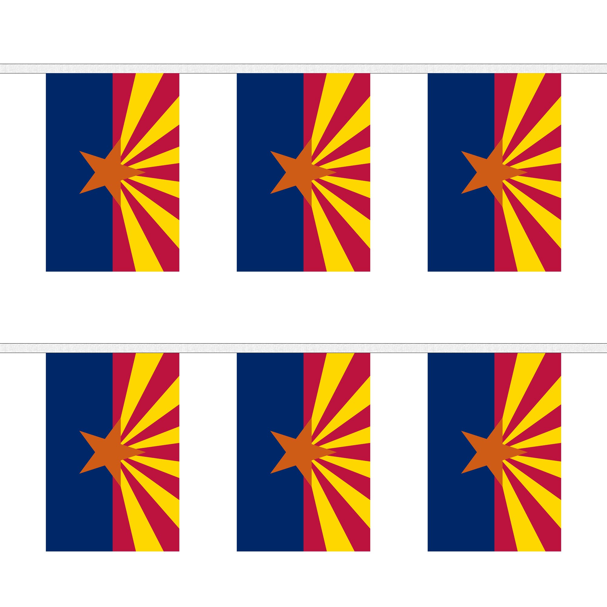 Celebrate the proud history and vibrant culture of Arizona with our premium Arizona Bunting. This striking decoration is more than just a string of flags; it represents Arizonaå¿åé©î iconic desert landscapes, rich Native American heritage, and its place within the United States. Whether you're hosting a state-themed event, celebrating Arizona Statehood Day, or decorating for a local festival, this versatile bunting is the perfect choice. The bunting features a series of rectangular pennants, each showcasing the Arizona state flag, which includes red and yellow rays emerging from the center, representing the stateå¿åé©î desert sun, and a blue field with a gold star in the lower left corner. This durable decoration is ideal for both indoor and outdoor use, adding a patriotic and festive touch to any setting. Whether you're celebrating Arizonaå¿åé©î history, hosting a local gathering, or showcasing the state's pride, this bunting is a must-have. Its weather-resistant materials and high-quality printing ensure that the vibrant colors remain bold and bright, regardless of the weather. Easy to hang and reusable for multiple events, this decorative garland offers both practicality and style. Show your love for Arizona with this high-quality, meaningful bunting.