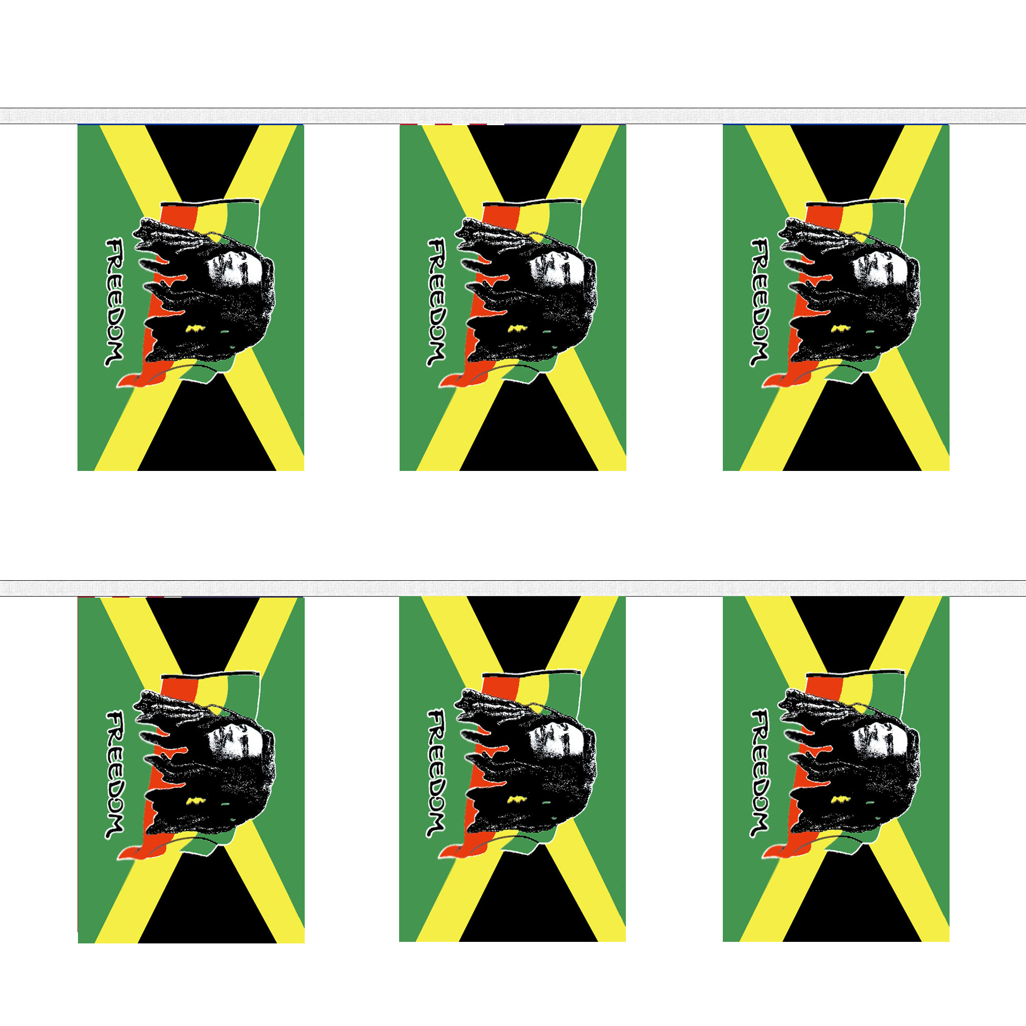 Celebrate the iconic legacy of Bob Marley and the vibrant culture of Jamaica with our premium Bob Marley (Jamaica) Bunting. This striking decoration is more than just a string of flags; it represents the powerful influence of reggae music, the spirit of unity, and the cultural richness of Jamaica. Whether you're hosting a reggae-themed party, celebrating Jamaicaå¿åé©î Independence Day, or decorating for a music festival, this versatile bunting is the perfect choice. The bunting features a series of rectangular pennants, each showcasing the colors of the Jamaican flagå¿å"green, yellow, and blackå¿å"along with an iconic image of Bob Marley. This durable decoration is ideal for both indoor and outdoor use, bringing a lively and festive atmosphere to any setting. Whether you're honoring Bob Marley's music, celebrating Jamaican culture, or simply expressing your love for reggae, this bunting is a must-have. Its weather-resistant materials and high-quality printing ensure that the bold colors remain vibrant, regardless of the weather. Easy to hang and reusable for multiple events, this decorative garland offers both practicality and style. Show your appreciation for Bob Marley and Jamaican culture with this high-quality, meaningful bunting.