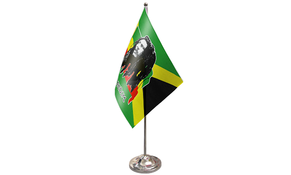 The Bob Marley (Jamaica) Satin Table Flag features the iconic green, yellow, and black colors of Jamaica, a nation known for its vibrant culture, musical heritage, and natural beauty. The flagà¢àâ¬àâ¢s design represents the unity, freedom, and resilience of the Jamaican people, and is also a tribute to Bob Marley, whose music and message of peace, love, and unity continue to inspire generations. Crafted from luxurious satin fabric, the flag boasts a smooth, glossy finish that enhances its bold colors, making it a standout addition to any event. Whether displayed at reggae festivals, Bob Marley tribute events, or as part of cultural exhibitions, this flag is a proud symbol of Jamaicaà¢àâ¬àâ¢s global influence. Mounted on a sturdy chrome pole and base, it remains securely displayed throughout any event, while its lightweight design ensures easy transport and setup.