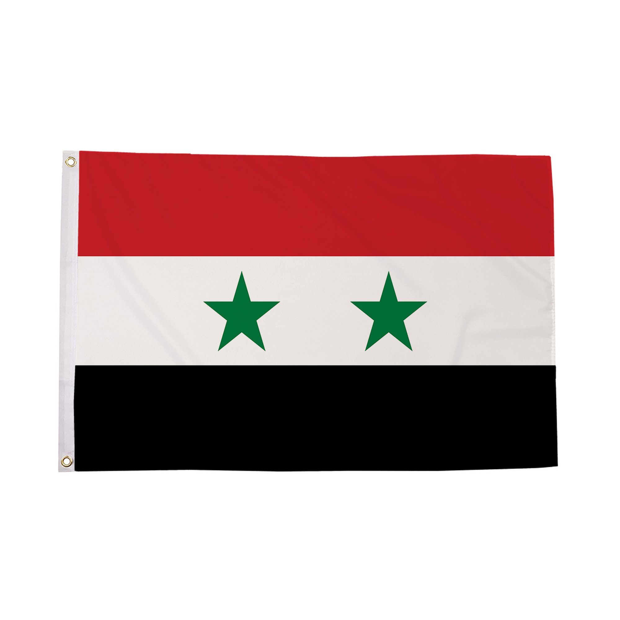 The Syria Flag is a bold and powerful symbol of Syrian identity and pride. The flag consists of three horizontal stripes-red, white, and black-representing the historical struggles and aspirations of the Syrian people. The red symbolizes courage and sacrifice, the white stands for peace and hope, and the black represents the struggles and determination of the nation. The two green stars in the white stripe reflect the unity and strength of the Syrian people and their dedication to the country's future. The Syria Flag is not just a national emblem but a reminder of Syria's rich history, culture, and the aspirations for a peaceful future.
