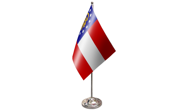 The Georgia State New Satin Table Flag proudly displays the official flag of Georgia, a symbol of the stateà¢àâ¬àâ¢s rich history and strong Southern identity. The flag consists of three horizontal stripesà¢àâ¬àâtwo red stripes on the top and bottom, and a white stripe in the middleà¢àâ¬àâalong with the state seal on the left-hand side. The seal features the pillars of the Georgia State Capitol, representing the strength of the state's government, and the motto "Wisdom, Justice, Moderation." Crafted from luxurious satin fabric, the flag boasts a smooth, glossy finish that enhances its vibrant colors, making it an eye-catching addition to any event. Whether displayed during Georgia Day, state celebrations, or cultural festivals, this flag proudly represents Georgiaà¢àâ¬àâ¢s identity and pride. Mounted on a sturdy chrome pole and base, it remains securely displayed throughout any event, while its lightweight design ensures easy transport and setup.