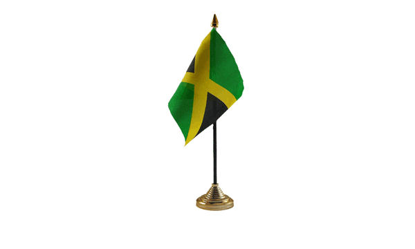 The Jamaican flag consists of four triangles: black and green on the top and bottom, with a gold diagonal cross separating them. The black represents the strength and creativity of the Jamaican people, the green symbolizes the land and hope for the future, and the gold stands for the natural resources and wealth of the island. Adopted in 1962, the flag represents the island's independence and the unity of its people. Our table flags display this vibrant design, offering a miniature version of the Jamaican flag for display at any occasion.