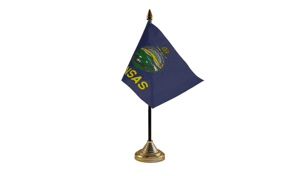 The Kansas flag features a rich blue background with a golden seal in the center, symbolizing the state's history and its agricultural contributions. The seal shows a rising sun over a landscape of fields and a river, highlighting Kansas' agricultural roots, while the gold border of the seal represents the state's richness and prosperity. The flag, officially adopted in 1961, represents Kansas' commitment to freedom, its agricultural heritage, and the spirit of independence. Our table flags proudly display this iconic design, offering a miniature version of Kansas' flag for display at any occasion.