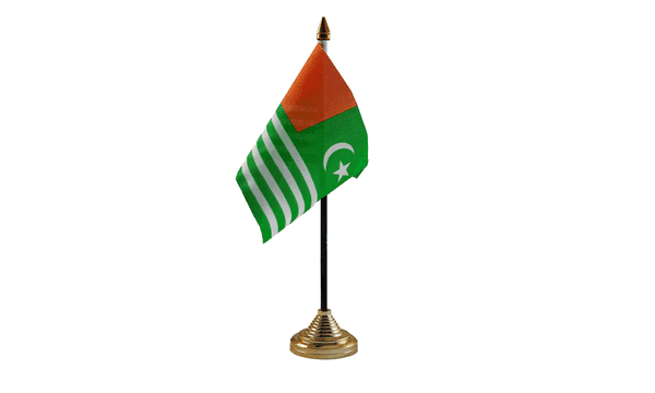 Celebrate the cultural pride and historical significance of Kashmir with our premium Kashmir Small Table Flags. Featuring the iconic green, white, and red design, this desk flag symbolizes Kashmir's heritage, beauty, and political significance. Whether displayed during cultural celebrations, historical events, or as part of your home or office decor, this table flag serves as a proud symbol of the region's rich identity. Made from high-quality materials, these miniature flags offer vibrant color and long-lasting durability.