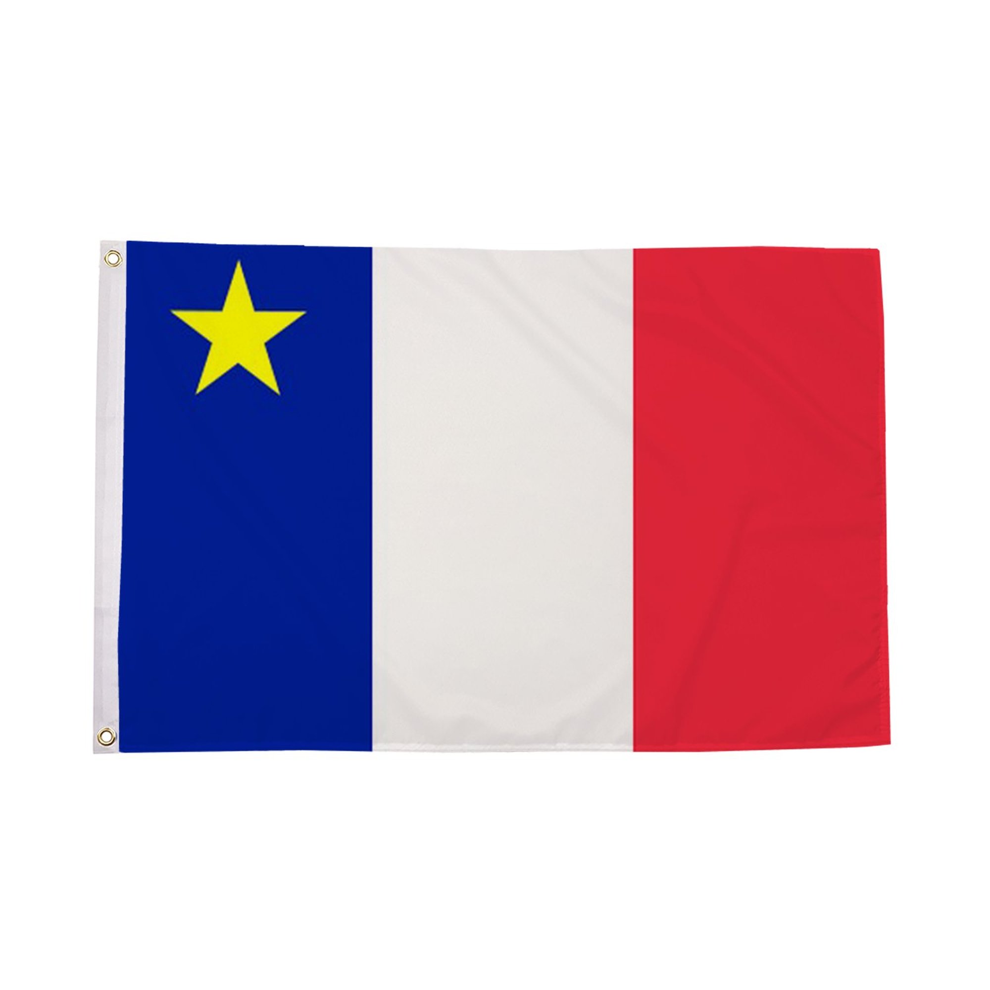 The Acadia Flag represents the historical and cultural heritage of the Acadian people, who have a rich history rooted in the Maritime regions of Canada. The flag is a symbol of pride and resilience for the Acadian community, capturing the spirit of a group whose identity is defined by both their historical experiences and the regions they inhabit. The Acadia Flag features a unique and meaningful design that incorporates the colors and symbols representing the Acadian people's rich history, their enduring spirit, and their continuous cultural contributions. Crafted from durable polyester, the flag is designed for both indoor and outdoor use, ensuring its colors and intricate details remain vibrant and intact, even in harsh weather conditions. Displaying the Acadia Flag is a way to honor the history, culture, and enduring legacy of the Acadian people, while fostering pride and recognition for their ongoing presence in the world.