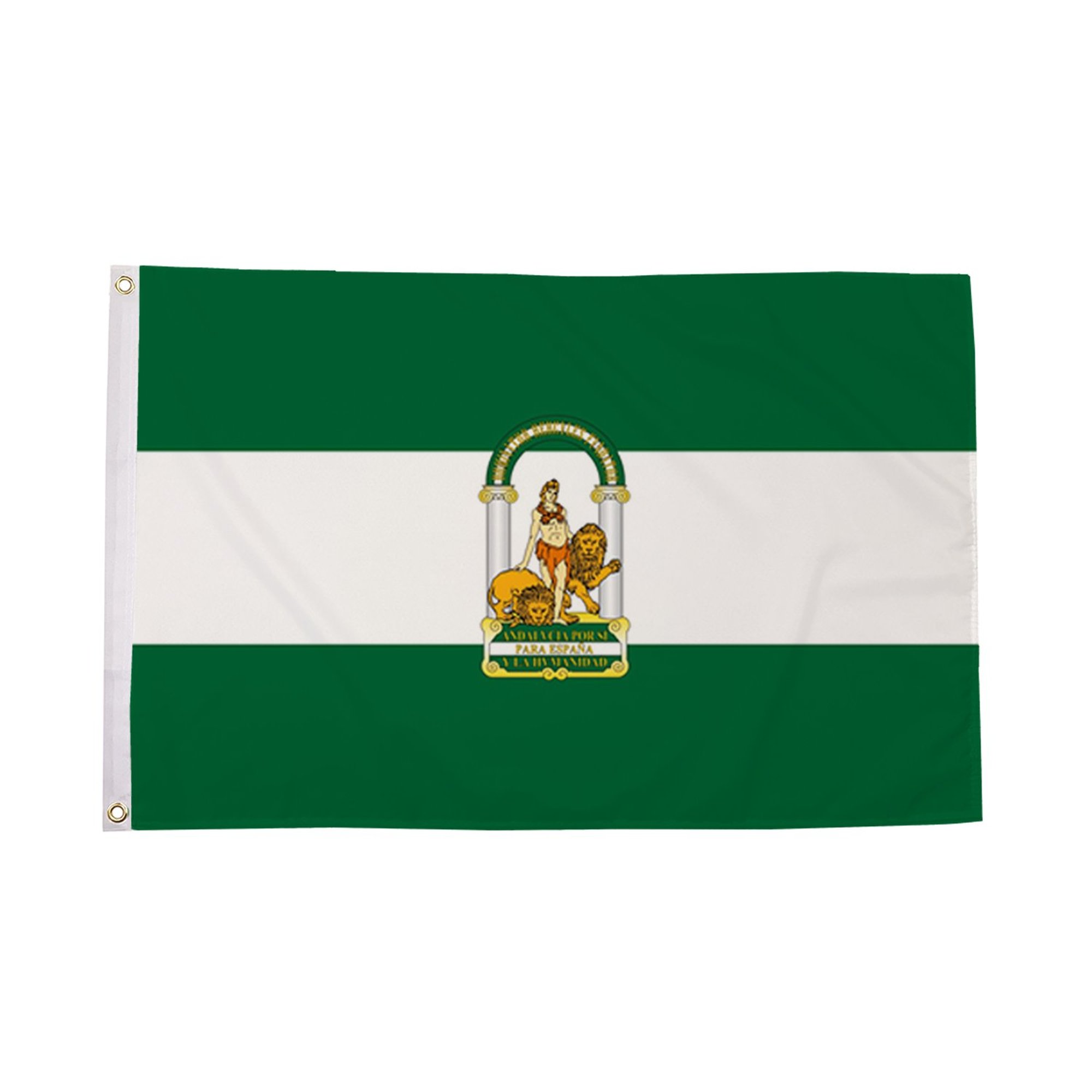 The Andalusia Flag is a powerful symbol of the Andalusia region in southern Spain, known for its vibrant culture, history, and deep connection to Andalusian identity. The flag consists of three horizontal stripes-green on the top, white in the middle, and green again on the bottom. At the center of the white stripe, the flag features the coat of arms of Andalusia, which includes a figure of Hercules holding two columns, symbolizing strength, unity, and the region's mythological history. The Andalusia Flag represents the pride of the Andalusian people, reflecting their unique heritage and their deep cultural ties to both Spain and the broader Mediterranean world. Crafted from durable polyester, this flag is designed for both indoor and outdoor use, ensuring that its vibrant colors and intricate design remain intact, even in harsh weather conditions. Displaying this flag is a way to celebrate the rich history, culture, and independence of Andalusia, while embracing the region's significance within Spain.