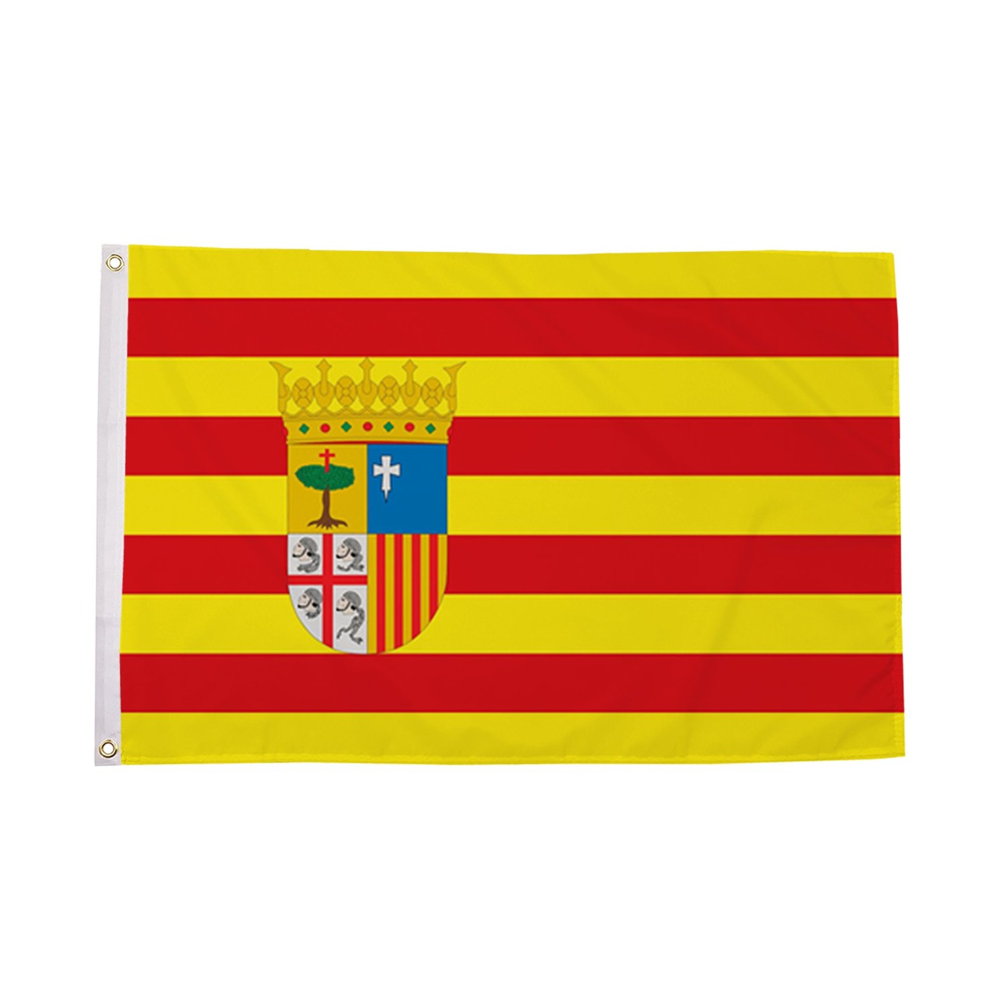 The Aragon Flag is a striking and historic symbol representing the Spanish region of Aragon, located in the northeastern part of Spain. The flag is composed of red and yellow horizontal stripes with a distinctive emblem in the center that includes a coat of arms. This simple yet bold design has been used for centuries to represent the Kingdom of Aragon, which once held significant political and cultural influence across the Iberian Peninsula. The red and yellow stripes symbolize the royal history of the region, as well as its longstanding connection to the crown of Aragon. The Aragon Flag is a proud representation of the region's history, from its medieval origins to its current status within Spain. Made from durable polyester, this flag is designed for both indoor and outdoor use, ensuring that its vivid colors and intricate design remain vibrant and intact regardless of the weather. Displaying the Aragon Flag is a tribute to the region's rich history and its role in the development of Spanish culture.