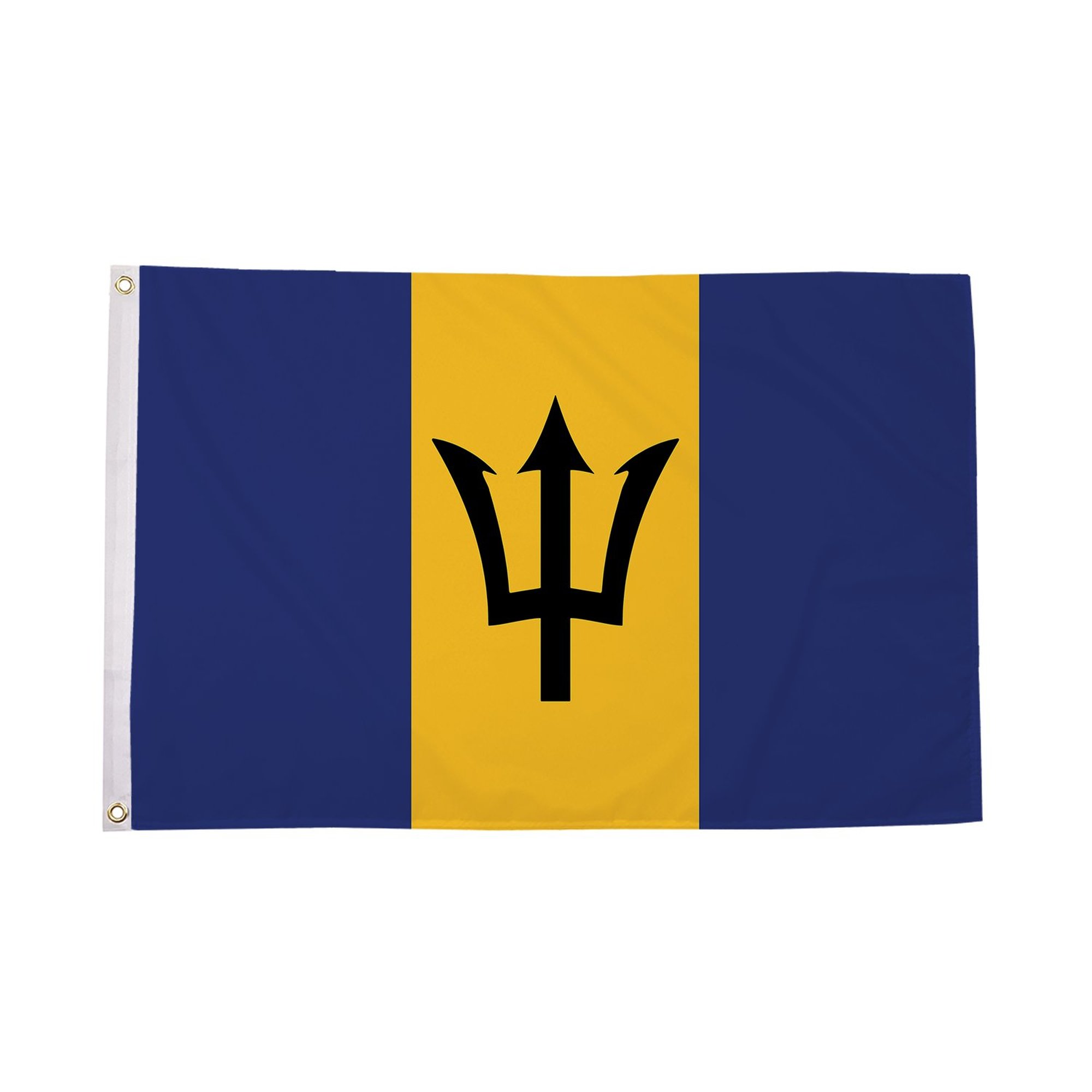 The Barbados Flag is a symbol of national pride, sovereignty, and the rich cultural heritage of Barbados. The flag features three vertical bands of ultramarine, gold, and ultramarine, with a black trident head in the center of the gold band. The ultramarine represents the sea and the sky, reflecting Barbados' natural beauty and the importance of the ocean to the island's economy and culture. The gold represents the fertile land of Barbados, which has sustained its people for centuries. The trident head, symbolizing the island's independence and the strength of the Barbadian people, is derived from the symbol of the island's national hero, Lord Nelson. Adopted on November 30, 1966, the Barbados flag was introduced on the day the island gained independence from the United Kingdom. Made from high-quality polyester, this flag is designed for both indoor and outdoor use, ensuring that its vibrant colors and bold design stay intact even in the harshest weather conditions. Whether flown during national holidays, at government buildings, or used as part of a collection, the Barbados Flag is a proud representation of the island's independence and cultural identity.