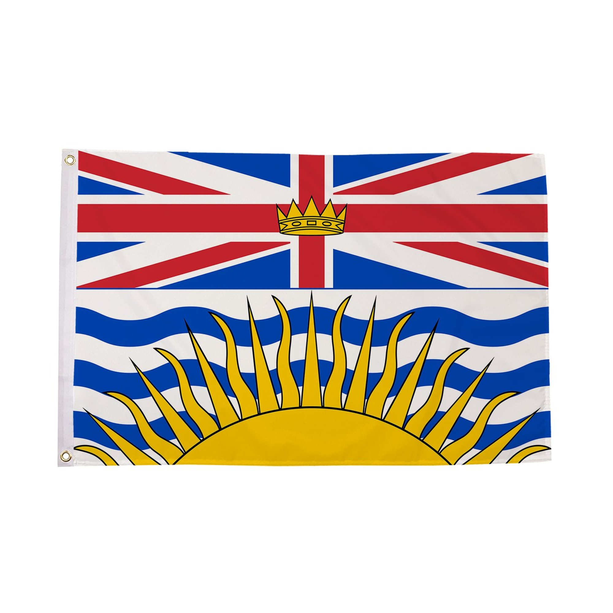 The British Colombia Flag combines rich symbolism and beautiful colors to reflect the province's natural beauty and historical ties. The design features a Union Jack at the top, representing British Colombia's historical association with the British Empire. Below the Union Jack is a stylized image of a rising sun, which symbolizes hope, growth, and the warmth of the province. The flag's blue and white colors represent the Pacific Ocean, while the golden sun signifies the province's promise and potential. The British Colombia Flag is a proud emblem of the province's identity and its ongoing connection to both Canada and the United Kingdom.
