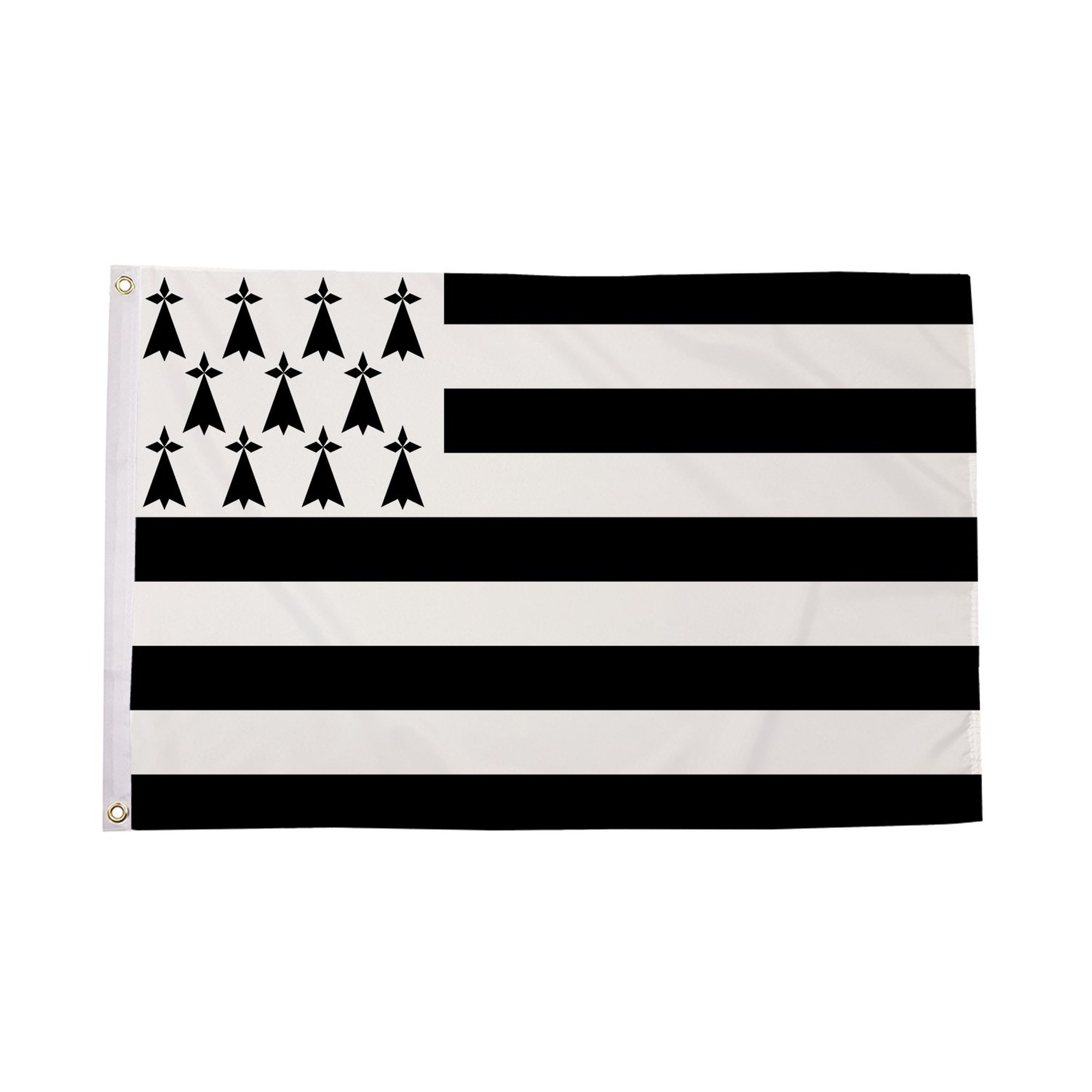 The Brittany Flag is a symbol of the rich history and cultural heritage of Brittany, a historic region in France with its own unique identity. The flag is composed of black and white horizontal stripes, reflecting the historical division between Upper and Lower Brittany, and the coat of arms (known as the "Gwenn-ha-du"), which features the ermine pattern that represents the nobility and royal heritage of the region. The Brittany flag is an emblem of regional pride, celebrating Breton culture, language, and history.