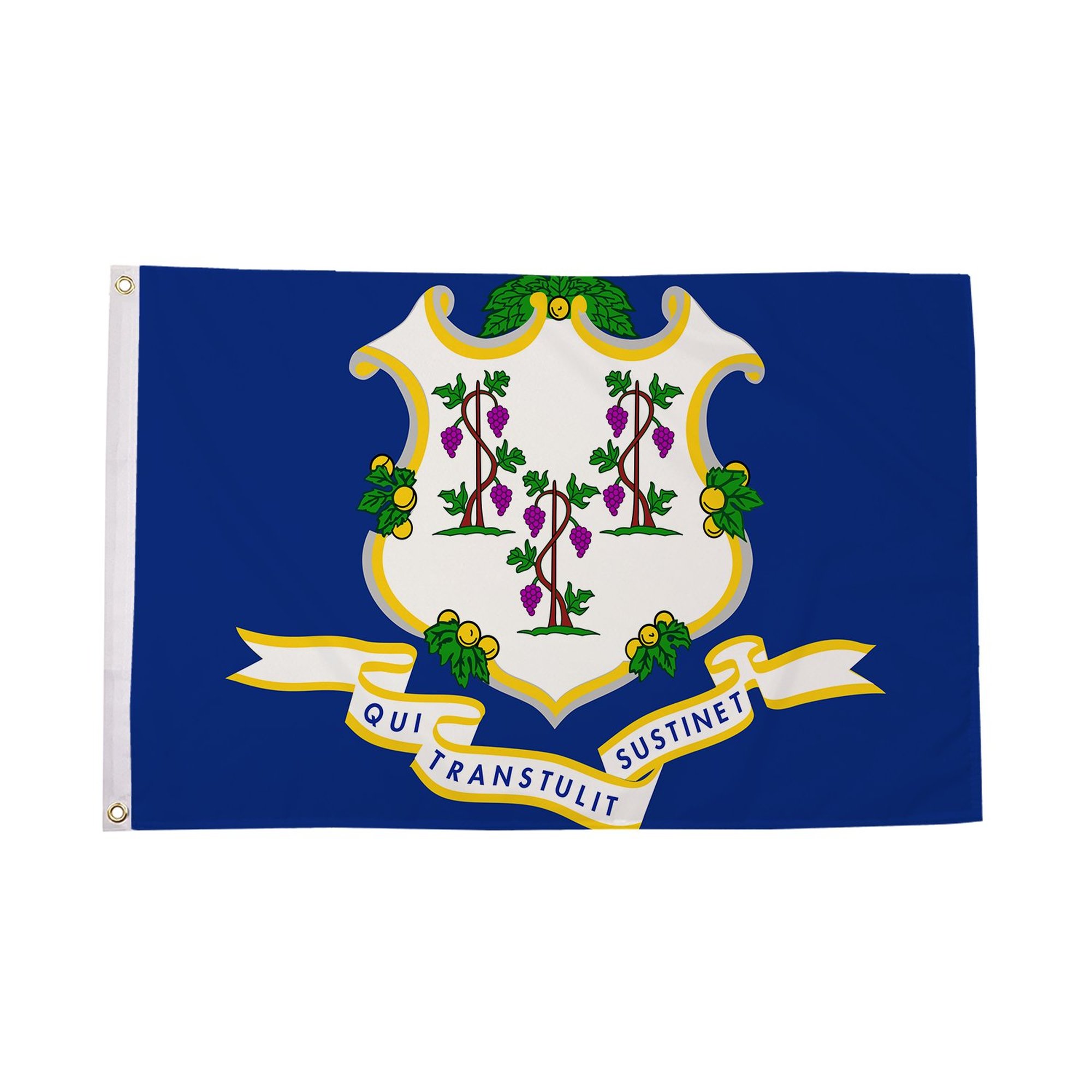 The Connecticut Flag is a unique and proud symbol of the state of Connecticut in the United States. Featuring a blue background with a central shield and three grapevines, this flag represents the state's rich history, natural beauty, and dedication to its heritage. The shield prominently displays three grapevines, symbolizing the state's early agricultural success, while the blue background reflects Connecticut's peaceful nature and commitment to unity. Whether you are a resident of Connecticut, a history enthusiast, or a collector, the Connecticut Flag is a perfect way to celebrate the state's pride and history. Crafted from durable polyester, this flag is designed for both indoor and outdoor use, ensuring that its vivid colors and intricate design remain vibrant through all seasons. Whether flown at public events, displayed in homes, or added to a collection, this flag proudly represents the spirit and heritage of Connecticut.
