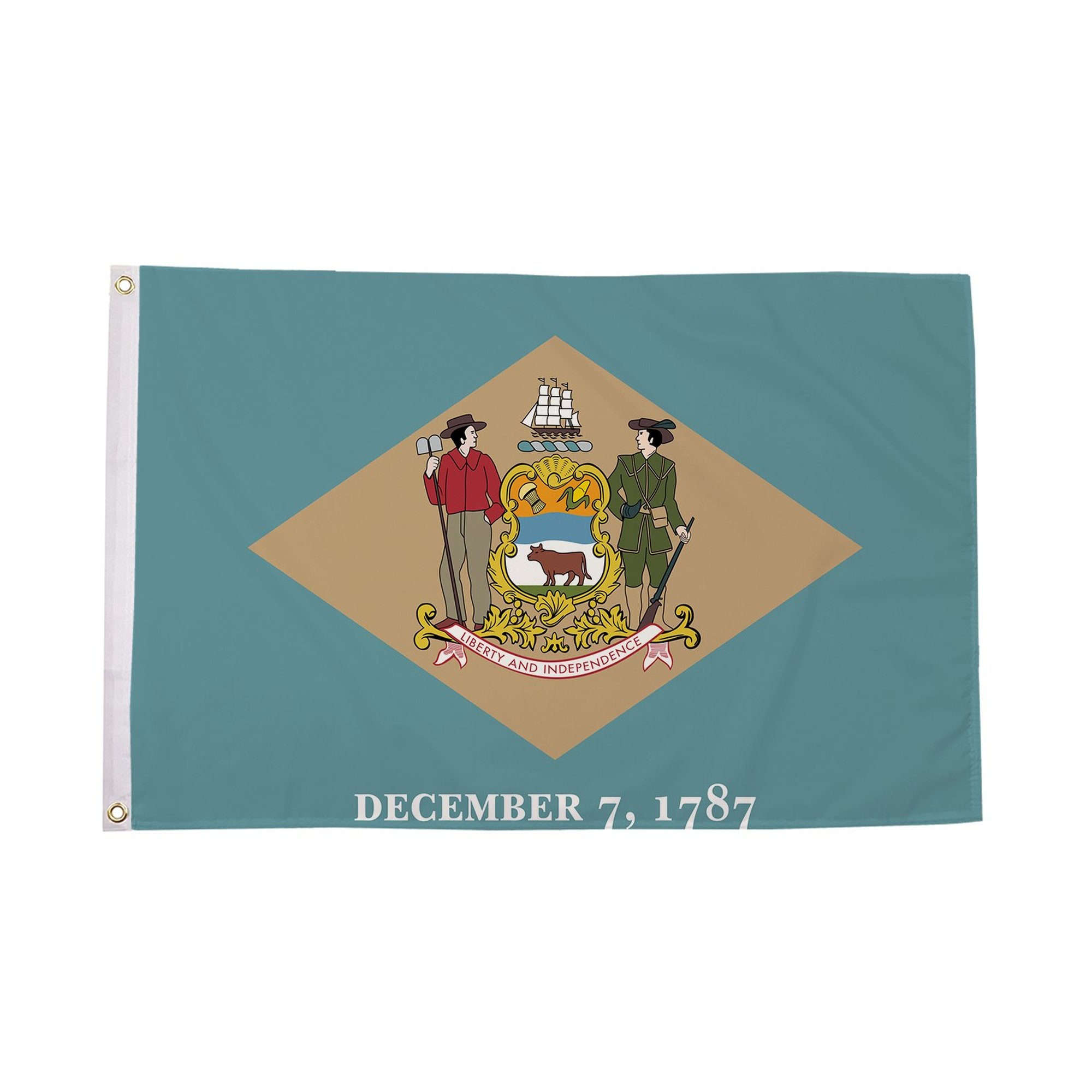 The Delaware Flag represents the state's rich history and commitment to freedom. With its distinctive buff-colored background, the flag features the state's coat of arms, showcasing a farmer and a sailor, which symbolize Delaware's agricultural and maritime heritage. The banner beneath the coat of arms displays Delaware's motto, "Liberty and Independence," reminding all who see it of the state's significant role in the formation of the United States.