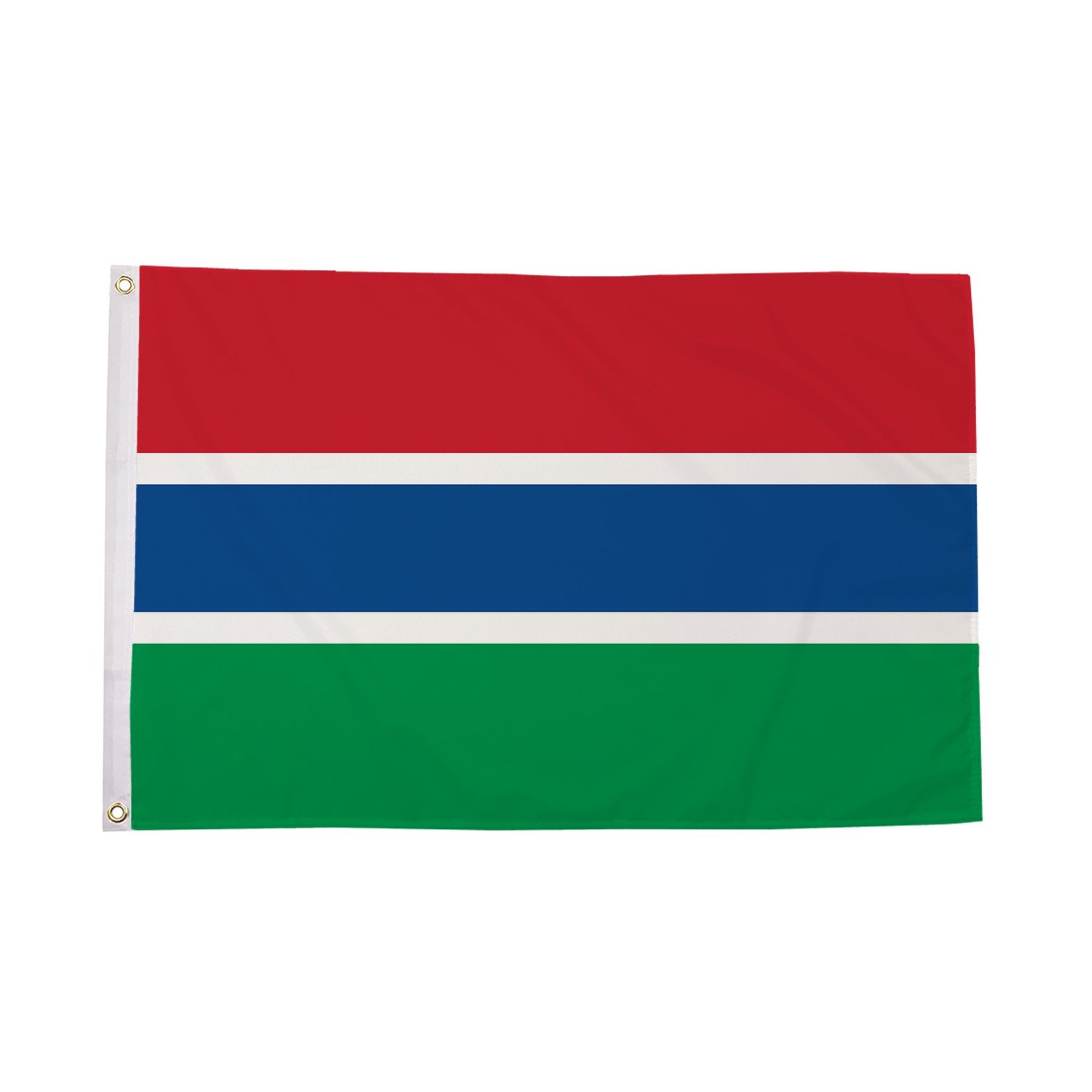 The Gambia Flag is a symbol of unity and pride for the nation of Gambia, located in West Africa. The flag consists of three horizontal stripes-red at the top, blue in the middle, and green at the bottom-representing the country's strength, peace, and agricultural wealth. The red color signifies the country's determination to achieve peace and prosperity, the blue represents the Gambia River, which flows through the country and symbolizes its importance to Gambia's history and economy, and the green stripe represents the agricultural abundance and natural resources of the country. The Gambia Flag serves as a lasting symbol of national pride, unity, and progress for the Gambian people. Made from durable polyester, this flag is designed for both indoor and outdoor use, ensuring that its vibrant colors and powerful symbolism remain visible through all seasons. Whether displayed during national holidays, political events, or as part of a personal collection, the Gambia Flag stands as a tribute to the country's unity, history, and bright future.