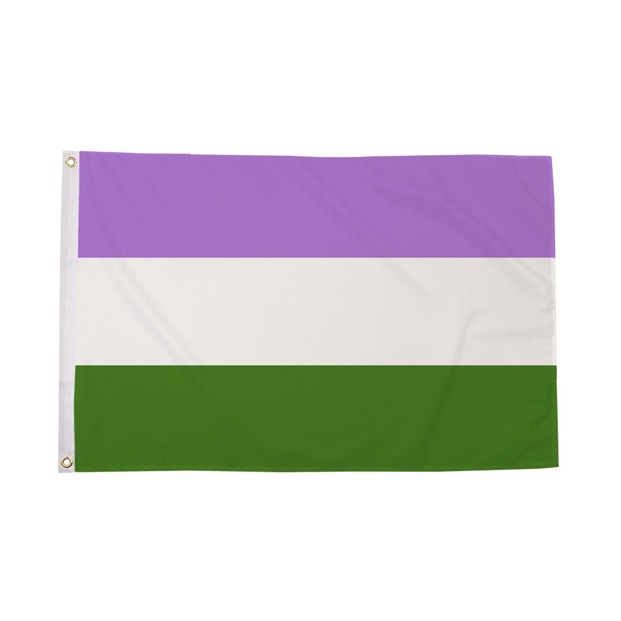 The Genderqueer Flag features three horizontal stripes: lavender, white, and green. The lavender stripe symbolizes a blending of masculinity and femininity, the white stripe represents gender neutrality or non-binary identities, and the green stripe represents those whose gender identity is outside the traditional male/female binary. This flag celebrates gender diversity, self-expression, and the fluidity of gender identities.