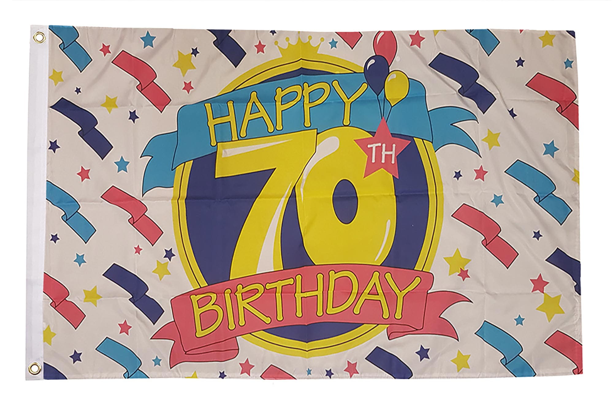 The Happy 70th Birthday Flag features bold, celebratory text and festive accents such as balloons, confetti, and stars, making it the perfect decoration to honor this important milestone in life.