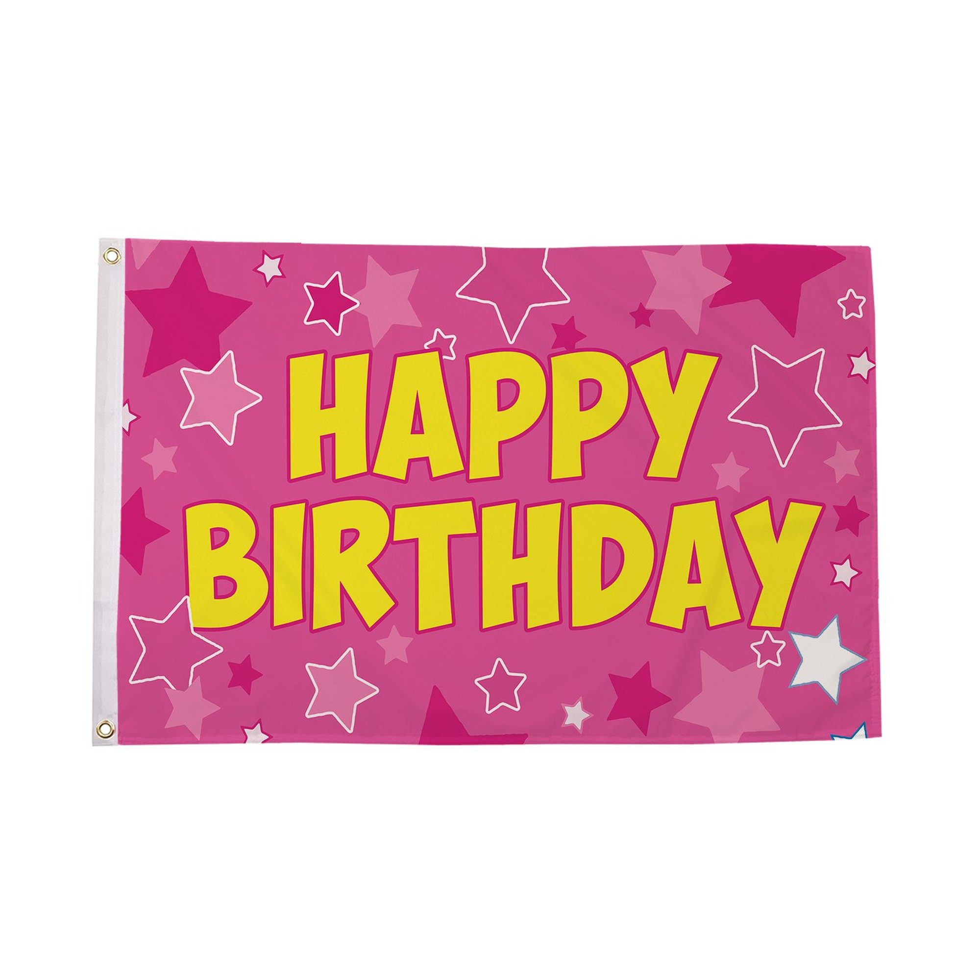 The Happy Birthday Pink Flag features a vibrant pink background and bold text, making it the perfect decoration for a cheerful birthday celebration.