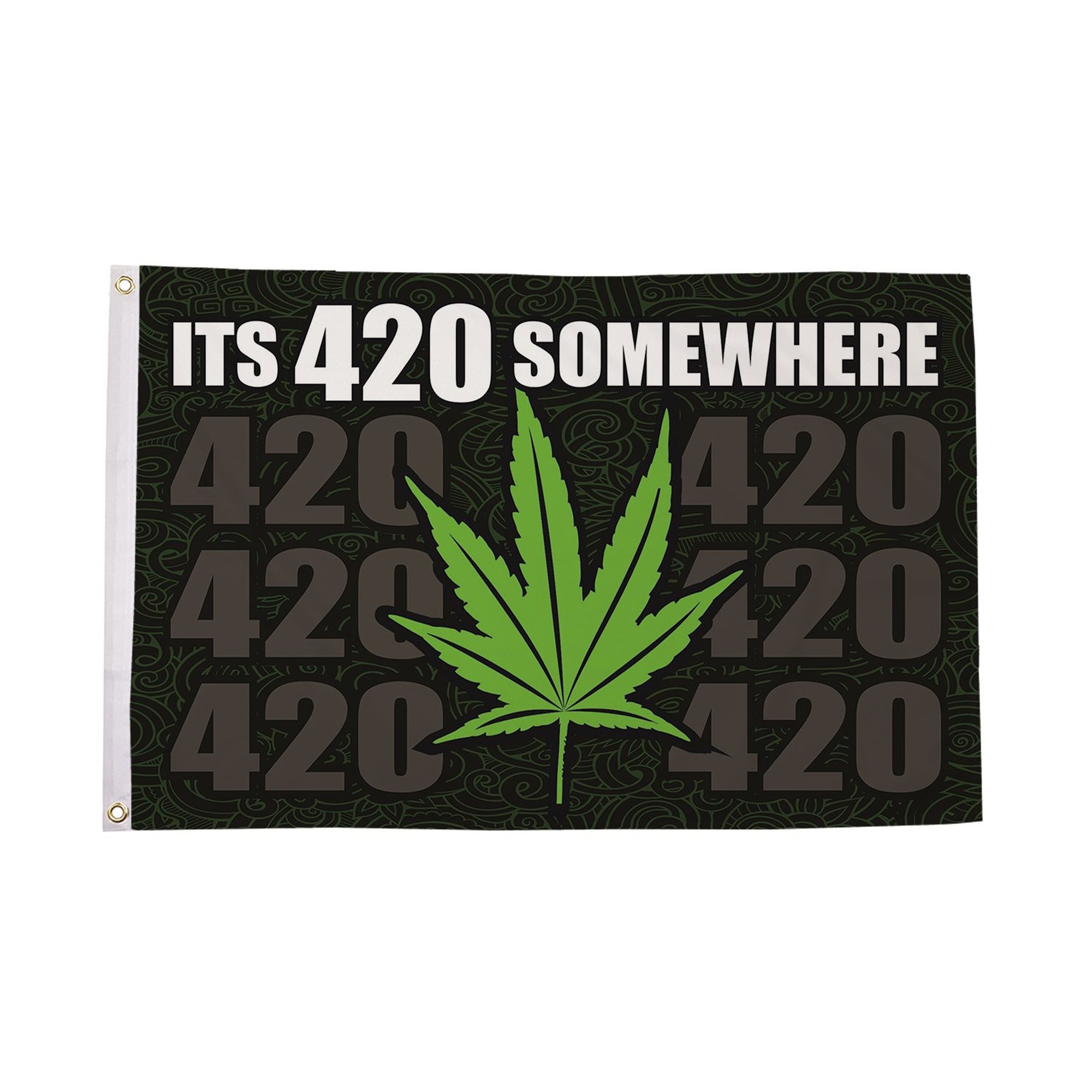 The It's 420 Somewhere Flag is the perfect flag for those who embrace the culture and fun of 420 celebrations, offering a lighthearted and bold way to celebrate the worldwide love for cannabis. Featuring the famous phrase "It's 420 Somewhere," this flag humorously reminds us that it's always the right time for a 420 break, no matter the hour. With its vibrant design, it's perfect for hanging at parties, events, or as a fun addition to your outdoor or indoor space. Crafted from durable polyester, the It's 420 Somewhere Flag is made to withstand outdoor conditions while maintaining its bright colors, whether it's displayed in your home, on your balcony, or at a gathering. Whether you're celebrating 420 in style or just want to bring a smile to your friends, this flag is a must-have.