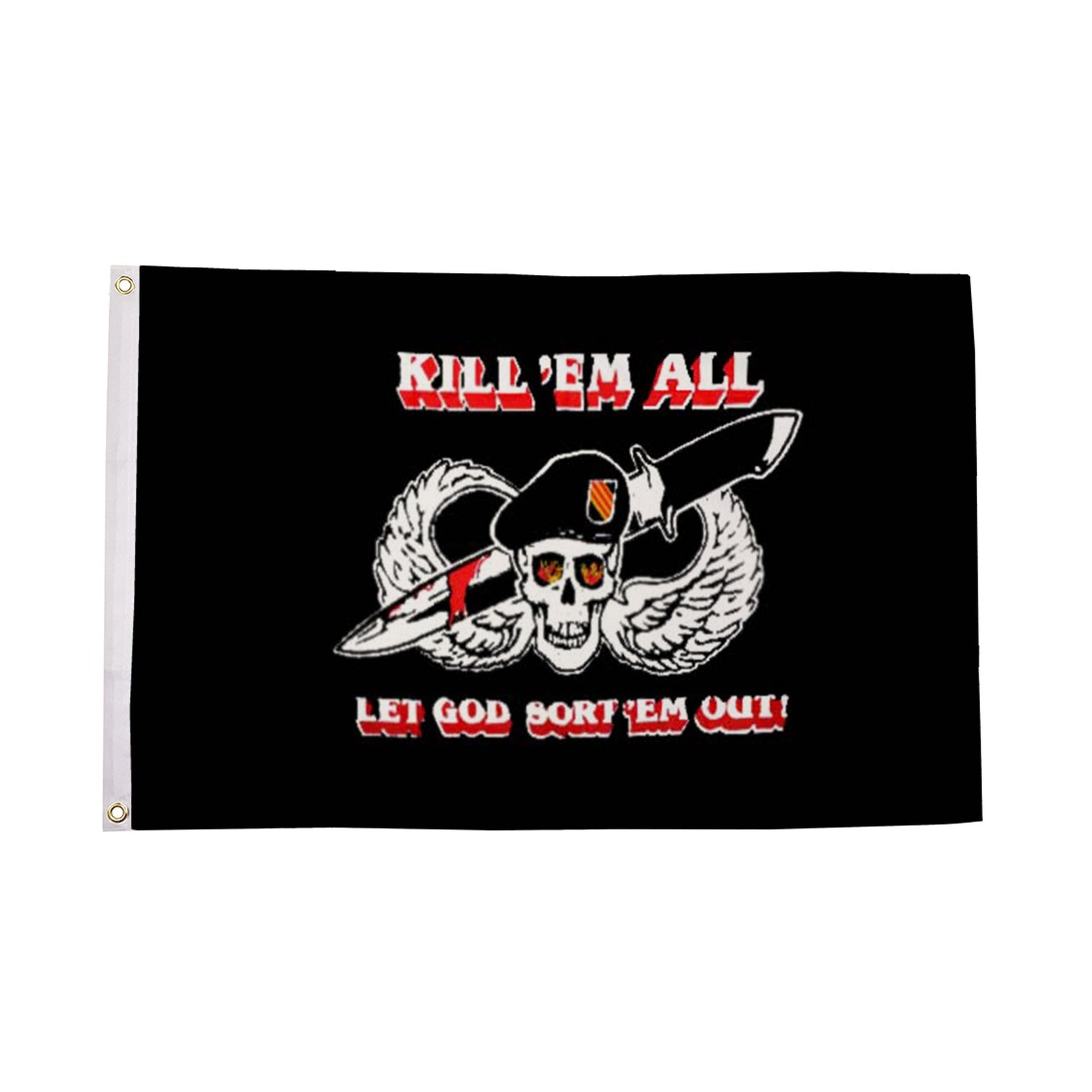 The Kill Em All Flag is designed for those who embrace boldness and make unapologetic statements. Featuring the powerful phrase "Kill Em All," the flag serves as a statement of strength, confidence, and a no-nonsense attitude. It is perfect for individuals who want to make a statement in any environment, whether it's an event, a personal collection, or as part of your home decor. The aggressive typography and vibrant design ensure that this flag stands out and grabs attention wherever it's displayed.