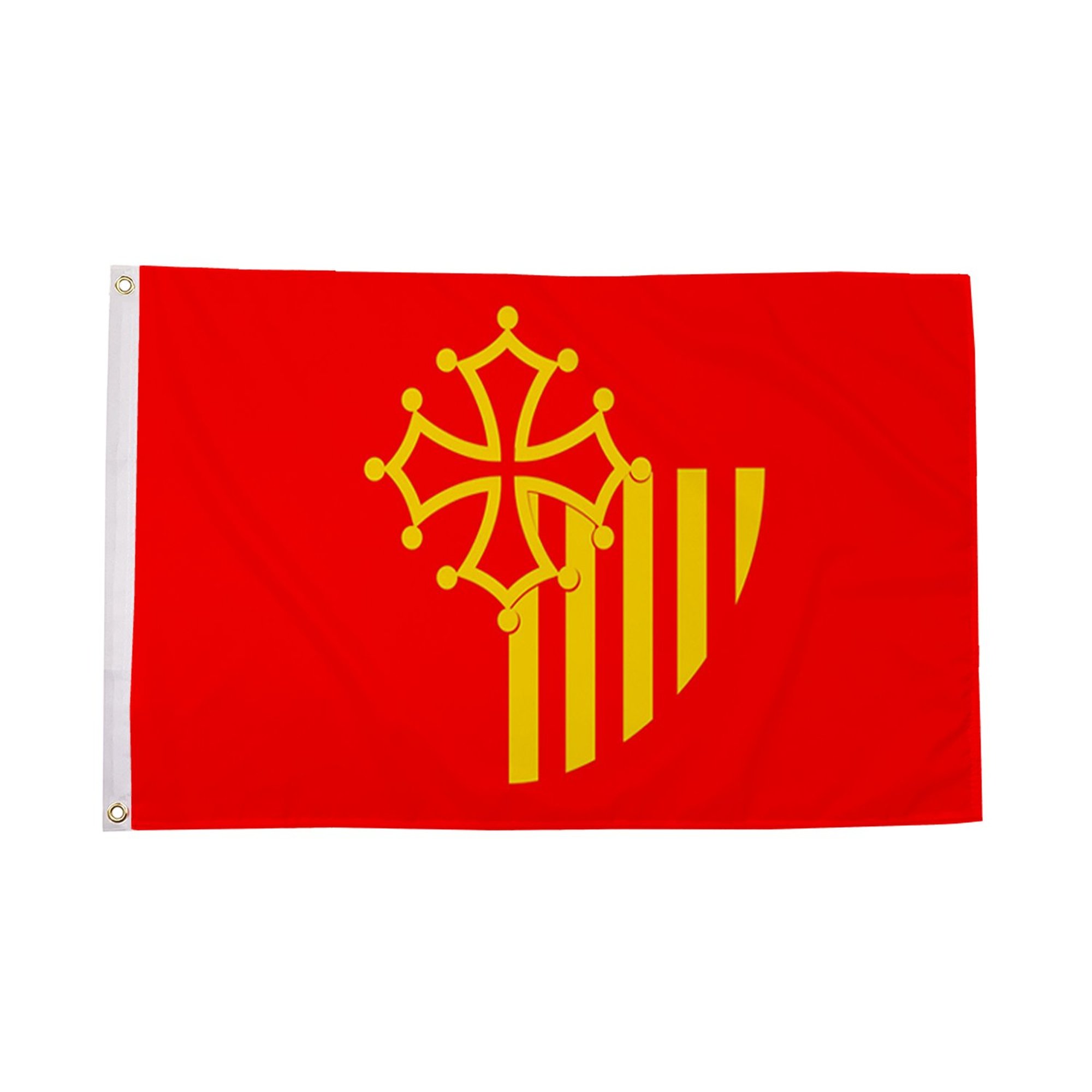 The Languedoc-Roussillon Flag is a symbol of the rich cultural heritage and historical significance of the Languedoc-Roussillon region in southern France. Featuring a striking design, the flag showcases a red background with a golden cross of the Occitan flag at its center, a powerful symbol representing the historical language and culture of the region. The Languedoc-Roussillon region, known for its beautiful landscapes, Mediterranean coastline, and deep cultural roots, is reflected in the flag's bold colors and historical emblem. Crafted from durable polyester, the Languedoc-Roussillon Flag is built to withstand outdoor conditions while maintaining its vivid colors and intricate design. Whether displayed during regional celebrations, cultural events, or as part of a personal collection, this flag proudly represents the proud identity and heritage of Languedoc-Roussillon.