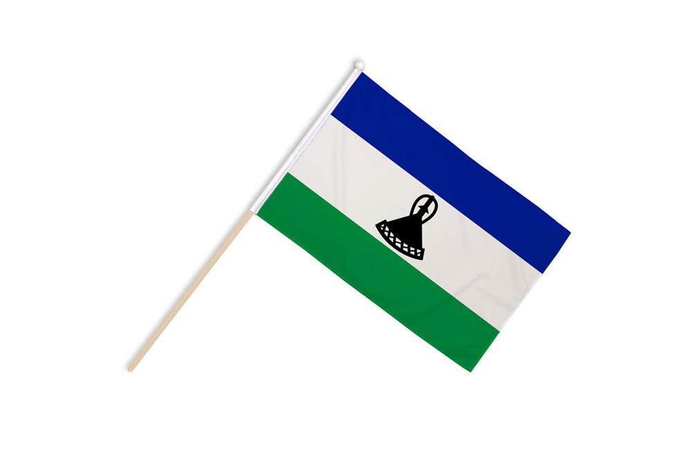 The Lesotho New Hand Flag proudly displays the national flag of Lesotho, with blue representing the sky and rain, white symbolizing peace and purity, and green representing the land and agriculture. The black shield and spear in the center of the flag represent the defense of the nation and its strength. This flag is a powerful reminder of Lesotho's sovereignty and its people's resilience.