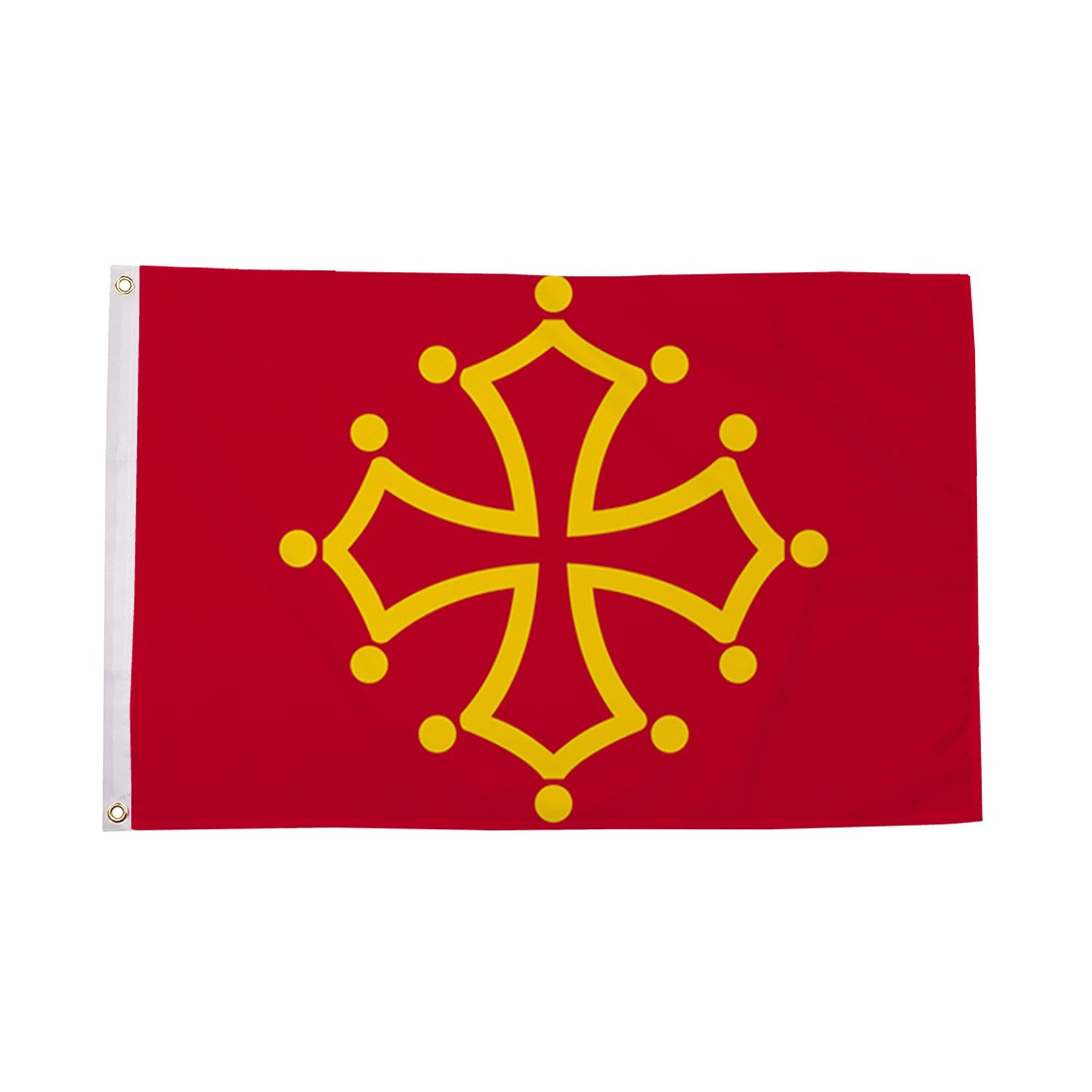 The Midi-Pyrenees Flag represents the historic and culturally rich region of Midi-Pyrenees, located in the southwest of France. The flag features a vibrant red background with a yellow cross and four symmetrical yellow fleurs-de-lis at each intersection, which are representative of the region's connection to the Occitan culture and history. The cross and fleurs-de-lis also symbolize the region's medieval heritage, particularly its significance in the Kingdom of Aragon. The Midi-Pyrenees Flag serves as a powerful symbol of pride, identity, and the cultural uniqueness of this beautiful part of France.