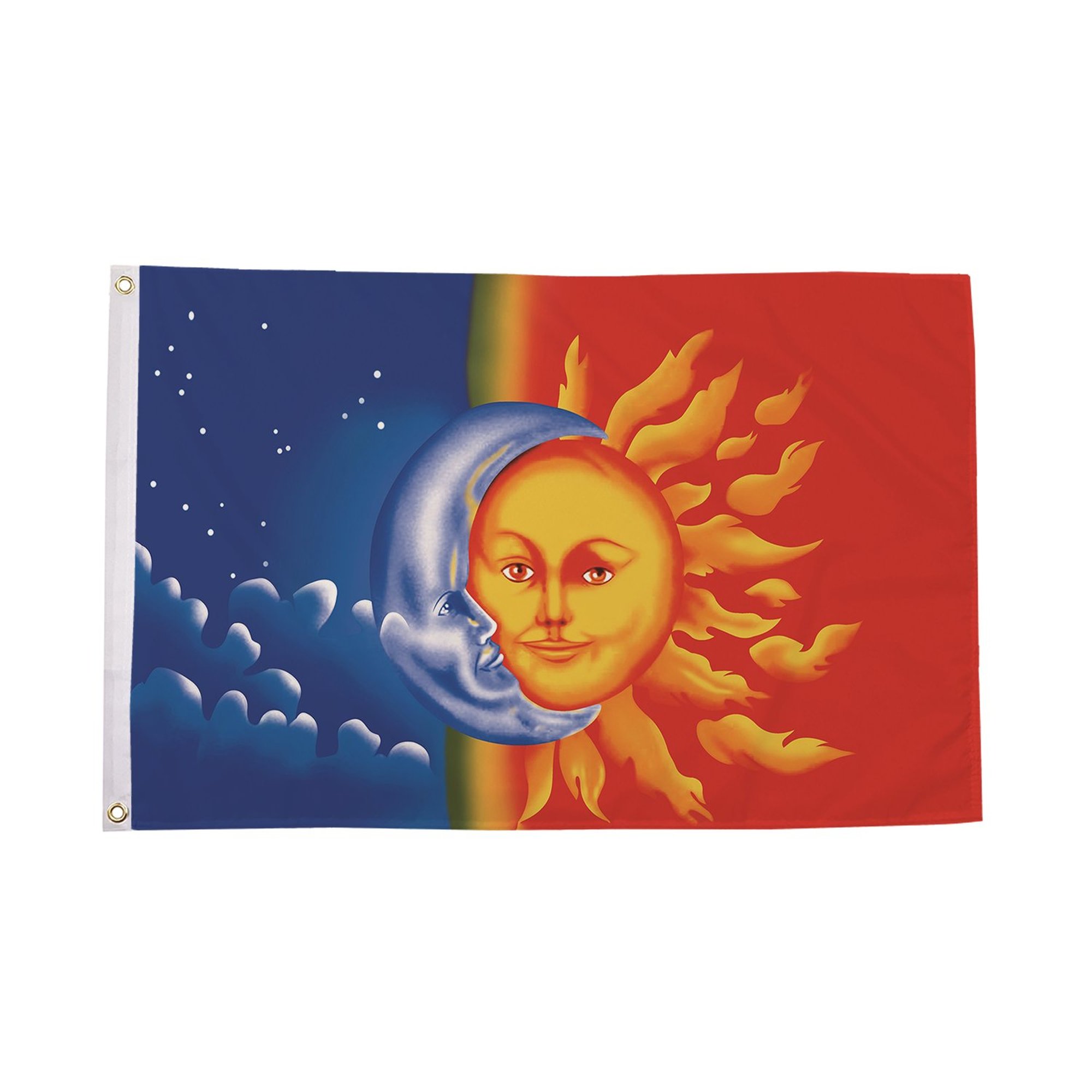 The Moon and Sun Flag combines two of the most significant celestial bodies in a harmonious design. The crescent moon, often associated with mystery, dreams, and the night, is balanced by the radiant sun, which symbolizes life, light, and the passage of time. This duality has been a central theme in many cultures and philosophies, representing the balance between opposing forces and the interconnectedness of all things. The Moon and Sun Flag serves as a powerful reminder of the balance between light and dark, day and night, and the cyclical nature of life and time.