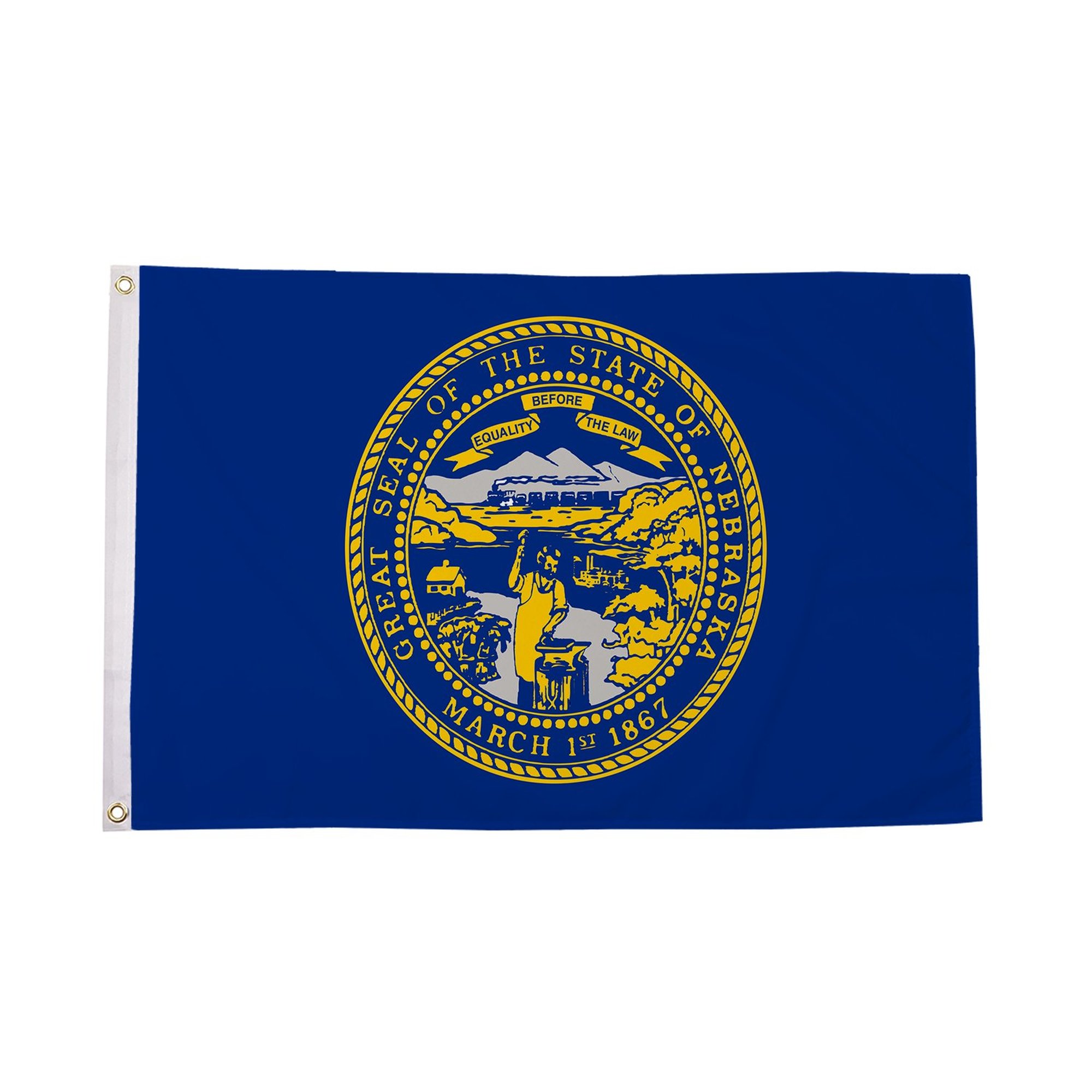 The Nebraska Flag is a proud symbol of the U.S. state of Nebraska, featuring a rich blue background with a state seal in the center. The seal depicts significant symbols of Nebraska's history and economy, including the state's natural resources, transportation, and agricultural heritage. The Nebraska Flag serves as a representation of the state's identity and its enduring commitment to progress and innovation. Its striking design and color make it an ideal flag for both official use and as a source of pride for Nebraskans. Display the Nebraska Flag to honor the state's rich history and modern achievements.