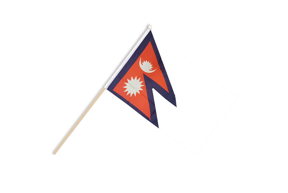 The Nepal Hand Flag proudly displays the national flag of Nepal, which consists of two stacked triangles. The red color of the flag symbolizes bravery, while the blue border represents peace. The flag's unique shape is a representation of Nepal's distinct cultural identity, and the sun and moon symbols signify the hope that Nepal will have the same longevity as the sun and moon.