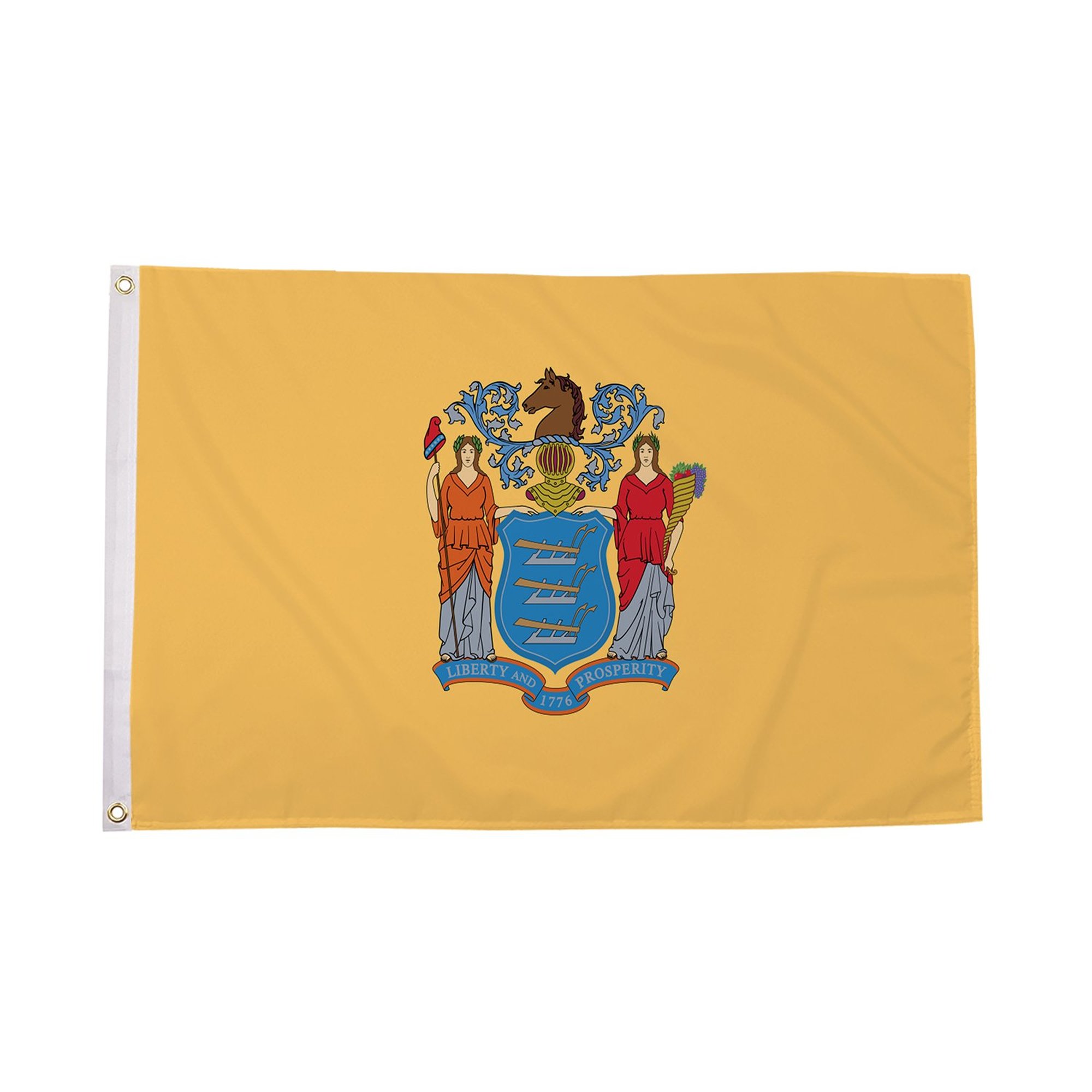 The New Jersey Flag is a striking and significant symbol of the U.S. state of New Jersey, featuring a vibrant gold background with the state coat of arms in the center. The coat of arms depicts two figures-Liberty, holding a staff topped with a Phrygian cap, and Ceres, the Roman goddess of agriculture, with a cornucopia-representing New Jersey's commitment to liberty and agriculture. The New Jersey Flag also incorporates the state's motto, "Liberty and Prosperity," which reflects the values of freedom, economic growth, and the state's historical role in the early formation of the United States. The flag is an emblem of the state's rich heritage and its continued role as a symbol of pride and unity for New Jerseyans.