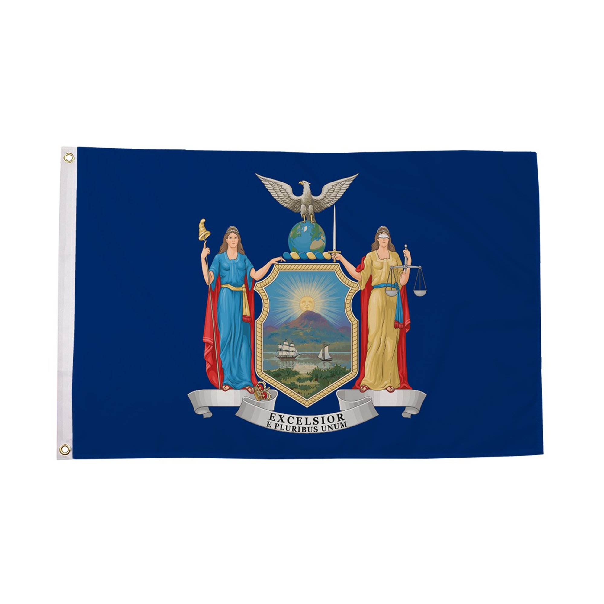 The New York Flag is a proud symbol of the U.S. state of New York. It features a deep blue field with the state seal in the center, which is flanked by two allegorical figures: Liberty and Justice. The seal includes important symbols such as a rising sun over a river, signifying New York's role as a land of opportunity and progress. Liberty holds a staff with a Phrygian cap, symbolizing freedom, while Justice holds a balance scale, representing fairness. The New York Flag is a strong visual representation of the state's rich history, commitment to freedom, and dedication to the pursuit of justice and equality for all.