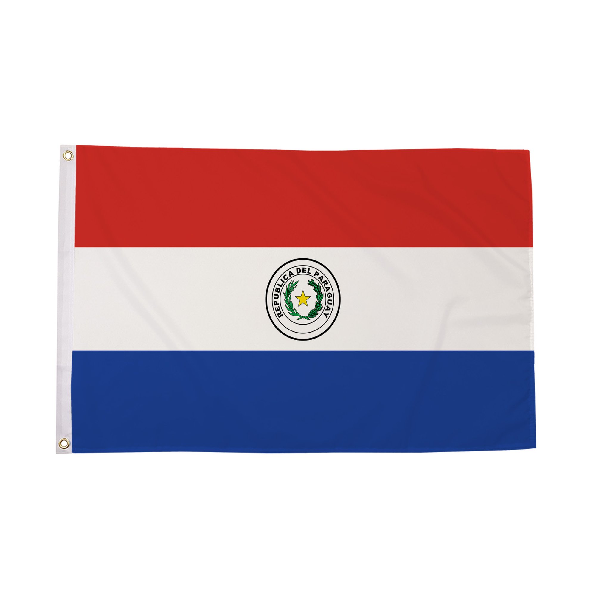 The Paraguay Flag is one of the only flags in the world with two different designs, one for the front and one for the back. The flag features three horizontal bands of red, white, and blue. The red color symbolizes the bravery and the sacrifices made by the people of Paraguay in the fight for independence. The white represents peace and unity, while the blue stands for liberty. On the front of the flag, there is the national coat of arms in the center of the white band, representing Paraguay's sovereignty and identity. The back of the flag features the seal of the treasury, highlighting the nation's rich economic history. The Paraguay Flag is an emblem of national pride and unity, often flown during national celebrations, cultural events, and on important government buildings.