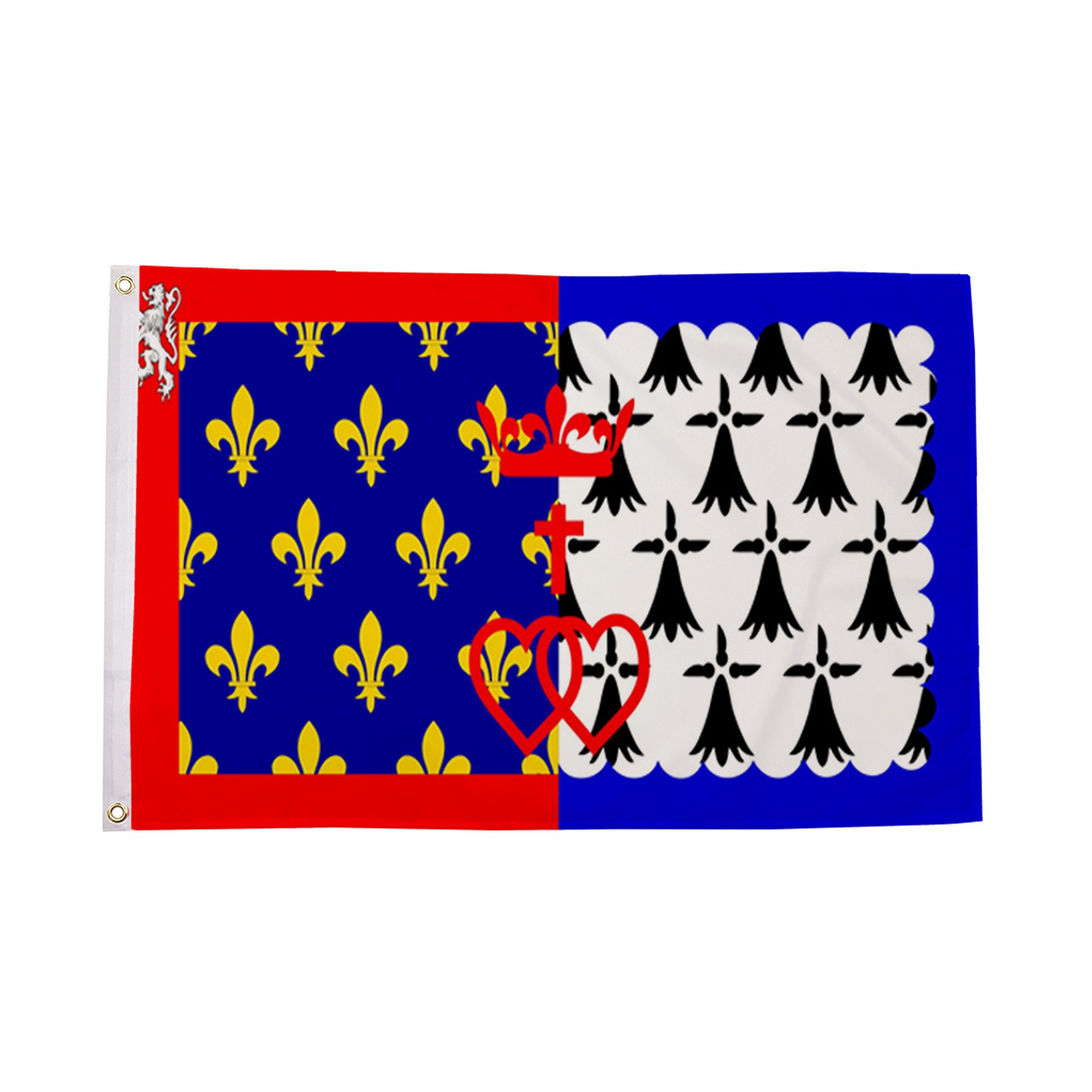 The Pays de la Loire Flag represents the historical and cultural region of Pays de la Loire in western France. This flag features the regional coat of arms, which highlights the heritage and identity of the region. The coat of arms includes a vibrant design with a combination of blue, gold, and white, symbolizing the rich history, tradition, and natural beauty of the area. The Pays de la Loire Flag is proudly displayed in various government buildings, during regional events, and cultural festivals. It is a symbol of pride for the people of Pays de la Loire and an emblem of their commitment to preserving the traditions, values, and unity of their region. Whether flown during national or regional celebrations, this flag stands as a powerful reminder of the region's significance within France and its distinct identity.