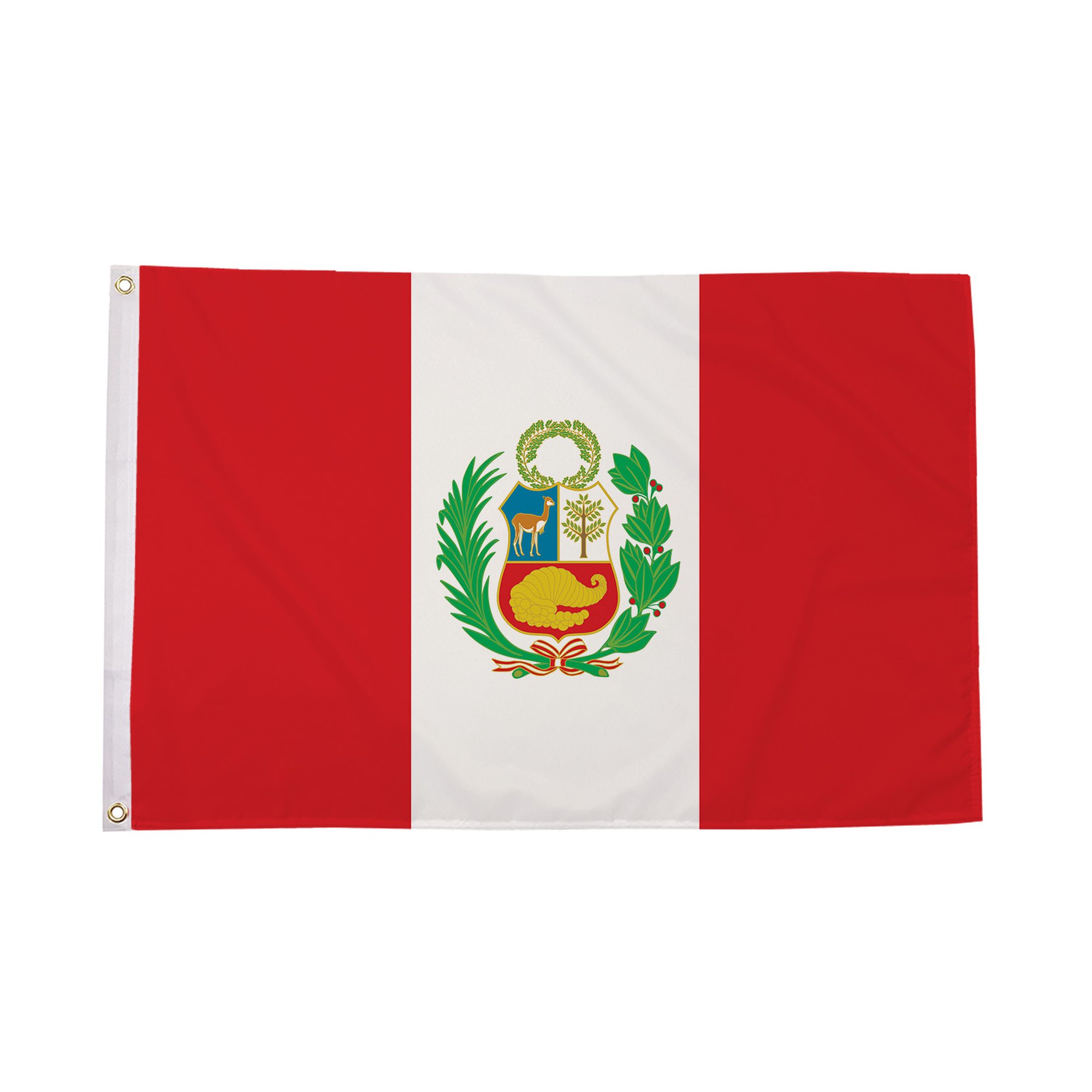The Peru Crest Flag features the national coat of arms, which includes a shield with a vicuà±a, the national tree of quinine, and a cornucopia spilling over with gold coins. These symbols represent Peru's natural wealth, agricultural traditions, and the historical importance of the Andean region. The coat of arms is surrounded by a bold red and white design, with the colors of the flag symbolizing the blood of those who fought for the country's independence and the peace and purity that has since followed.