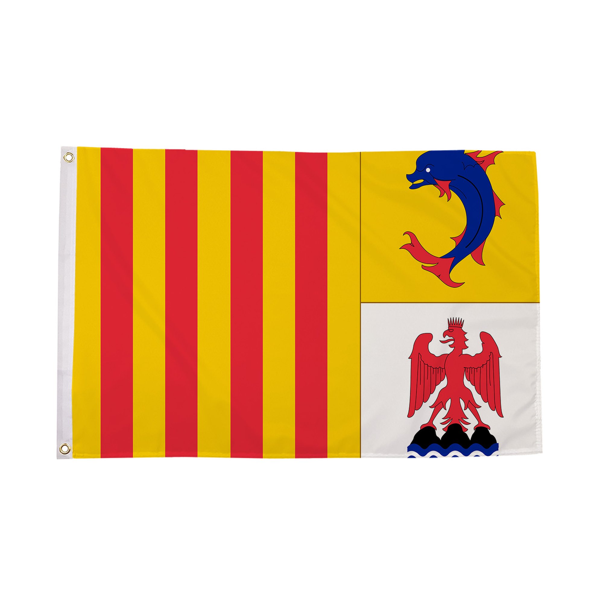 The Provence-Alpes-Cà´te d'Azur Flag is a vibrant and meaningful symbol representing one of the most beautiful and culturally rich regions of France. Provence-Alpes-Cà´te d'Azur (PACA) is known for its stunning landscapes, ranging from the rugged Alps to the Mediterranean coastline. The flag features a combination of bold colors and traditional elements that highlight the region's historical significance, cultural heritage, and natural beauty. The Provence-Alpes-Cà´te d'Azur Flag often incorporates elements such as the traditional yellow and red of Provence, which are derived from the region's historical roots and the emblematic colors of the Provence coat of arms. Displayed at regional festivals, public events, and national celebrations, the flag is a proud representation of the region's diverse identity. Made from durable polyester, this flag is designed to retain its striking colors and crisp design, whether flown at outdoor events or displayed indoors to celebrate the cultural pride of Provence-Alpes-Cà´te d'Azur.