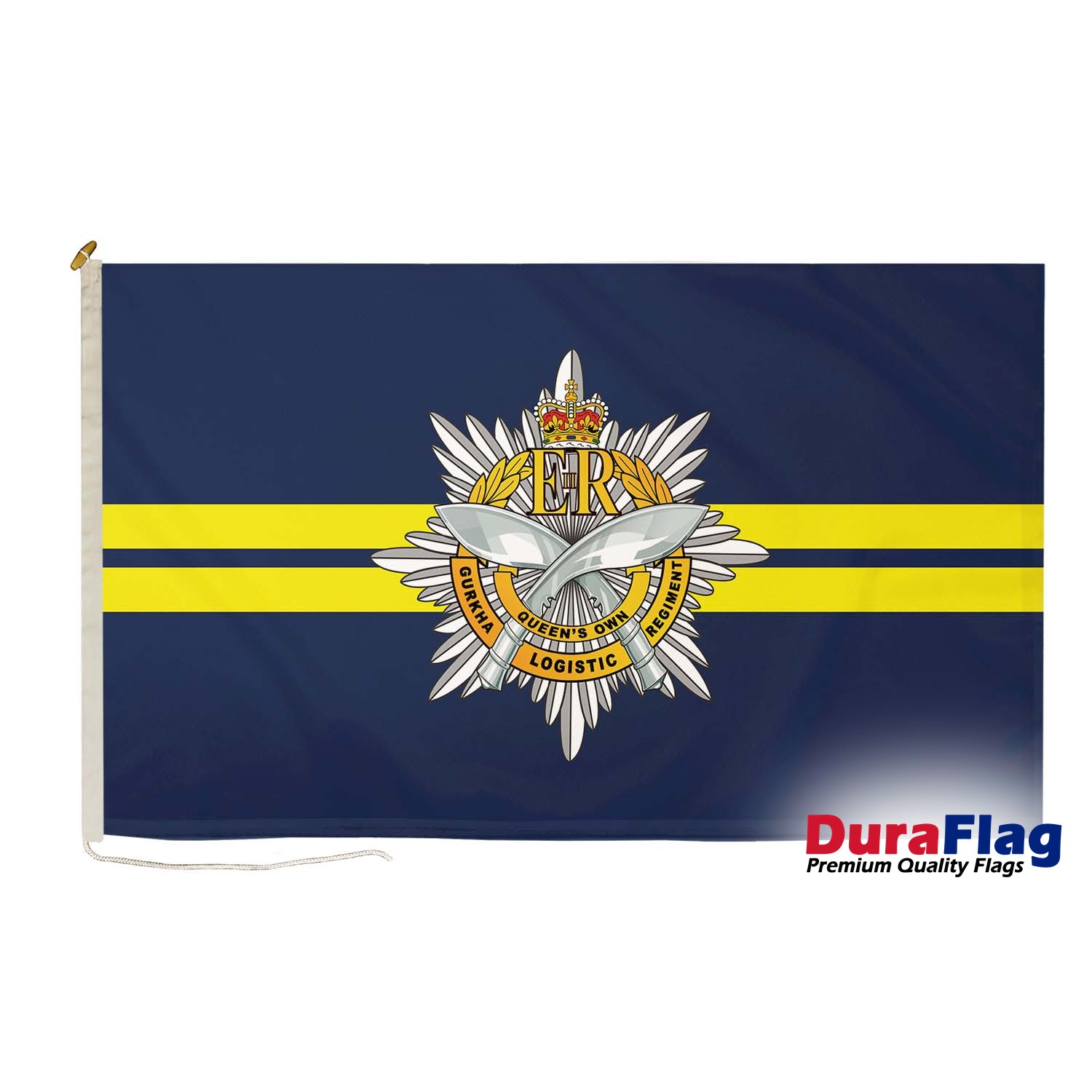 The Queen's Own Gurkha Logistic Regiment DuraFlag is a proud tribute to one of the most renowned regiments in the British Army. Featuring the official insignia of the Queen's Own Gurkha Logistic Regiment (QOGLR), this flag represents the courage, dedication, and exceptional service of the Gurkha soldiers. Known for their bravery, discipline, and elite status, the Gurkhas have served in various military operations worldwide. Made from durable, weather-resistant materials, the Queen's Own Gurkha Logistic Regiment DuraFlag ensures vibrant color retention and resilience, even in tough outdoor conditions. Whether displayed at military commemorations, Gurkha reunions, or as a mark of respect for their incredible service, this flag is perfect for both indoor and outdoor use. With versatile fitting options such as rope and toggles, clips, and D-rings, it's easy to show your respect for the regiment wherever it's needed.