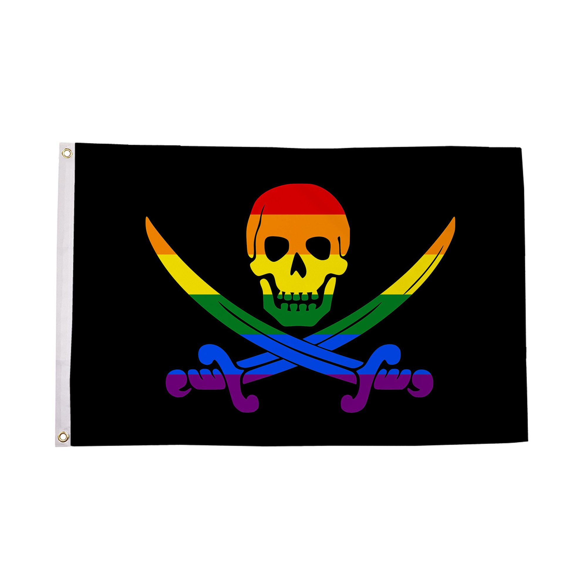 The Rainbow Pirate Flag combines the bold spirit of pirate imagery with the vibrant colors of the LGBTQ+ rainbow flag, creating a unique symbol of pride, freedom, and rebellion. Featuring the iconic skull and crossbones emblem, commonly associated with pirate flags, set against a backdrop of rainbow stripes, this flag represents not only the pirate spirit of defiance but also the ongoing fight for equality and inclusivity. Whether flown at Pride events, pirate-themed parties, or as a statement of individuality and solidarity, the Rainbow Pirate Flag boldly declares that love and freedom should never be confined to one set of rules. Made from durable polyester, this flag is designed to withstand the elements and maintain its striking design in both outdoor and indoor settings.
