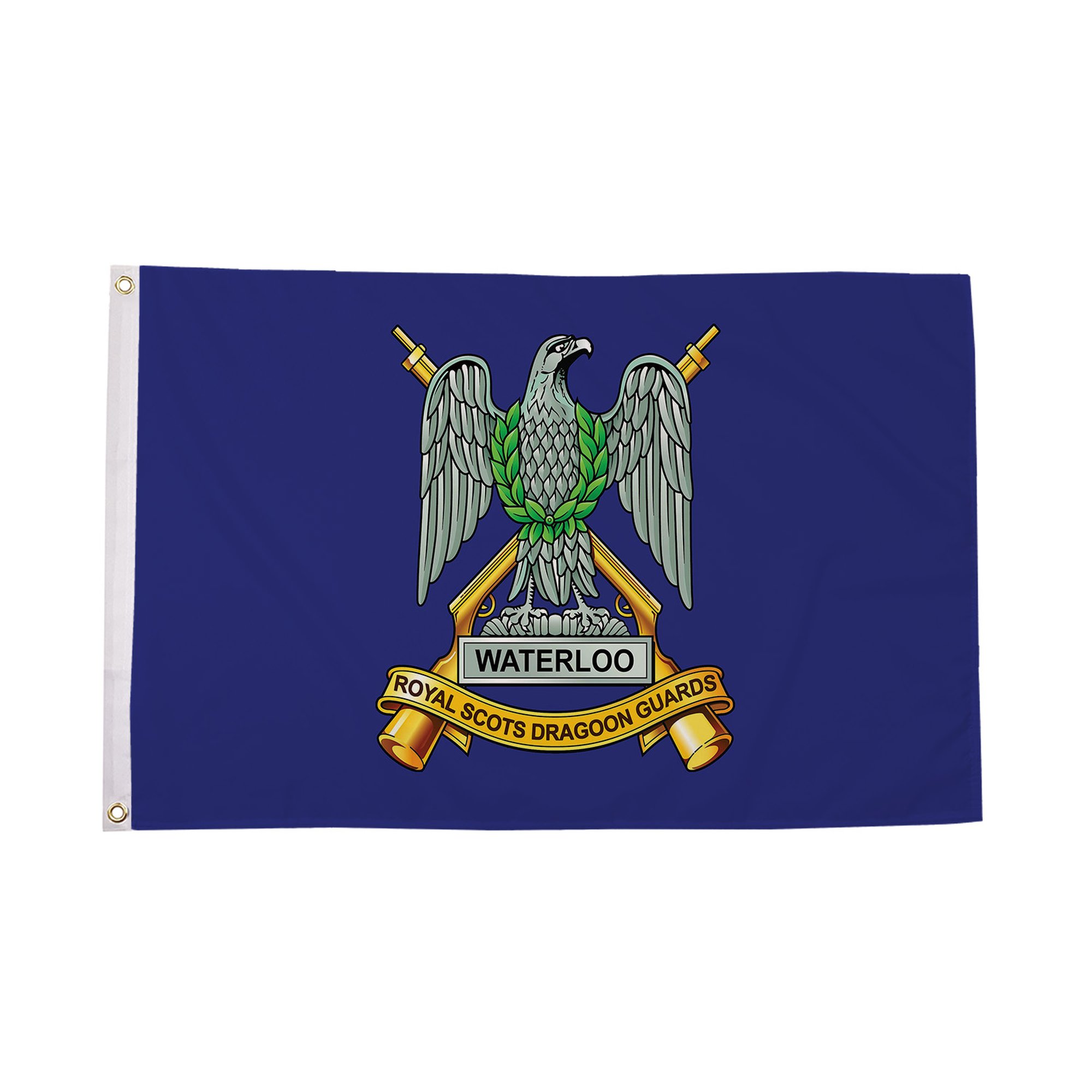 The Royal Scots Dragoon Guards Flag honors the regiment's long and storied history. Founded in 1678, the regiment has been an integral part of the British Army, serving in various capacities, including cavalry and reconnaissance roles. Over the centuries, the regiment has participated in numerous significant battles, including the Battle of Waterloo and recent engagements in Iraq and Afghanistan. The flag features the regiment's emblem, signifying the honor and courage of those who have served in the regiment throughout its history.