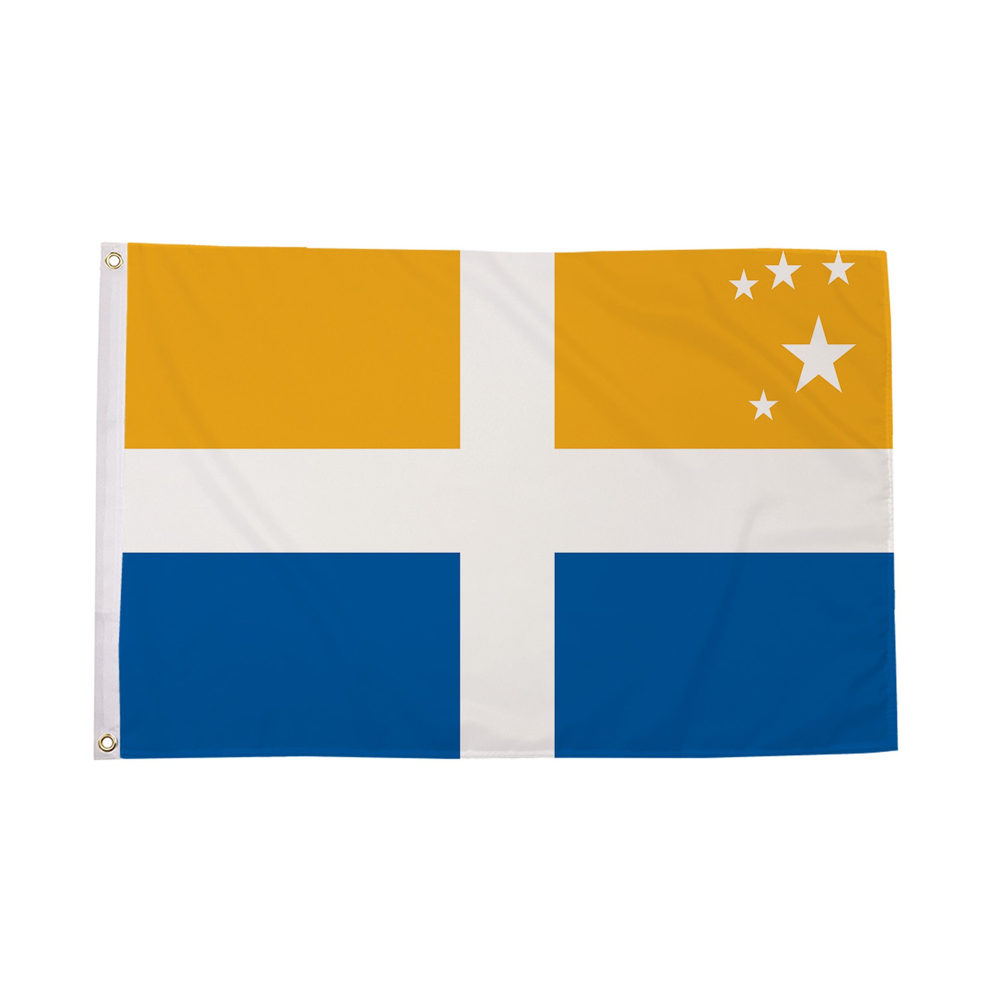 The Scilly Isles (Cross) Flag is an iconic representation of the Scilly Isles, an archipelago off the southwestern tip of England. The flag's design features a bold cross that reflects the region's connection to its maritime heritage and the Christian faith. The flag showcases a white cross on a vibrant blue background, symbolizing peace, unity, and the beautiful coastal waters surrounding the islands. The Scilly Isles (Cross) Flag is a proud emblem of the islands' distinctive identity and cultural history, ideal for use during local festivals, public events, or as part of private collections celebrating the beauty and history of this unique British territory.