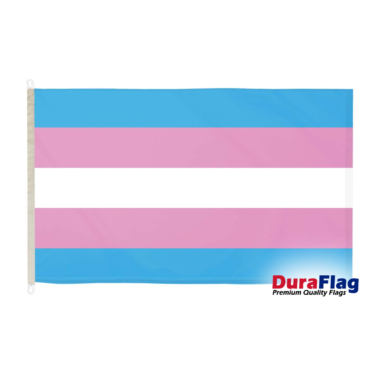 The Transgender (New) DuraFlag features the updated design of the transgender pride flag, which incorporates five horizontal stripes: two light blue stripes (representing the traditional color for boys), two pink stripes (representing the traditional color for girls), and a single white stripe in the center, which represents those who are transitioning, non-binary, or identify with a gender outside of the male and female binary. This flag was designed to give visibility to the transgender community and promote understanding, acceptance, and equality.
