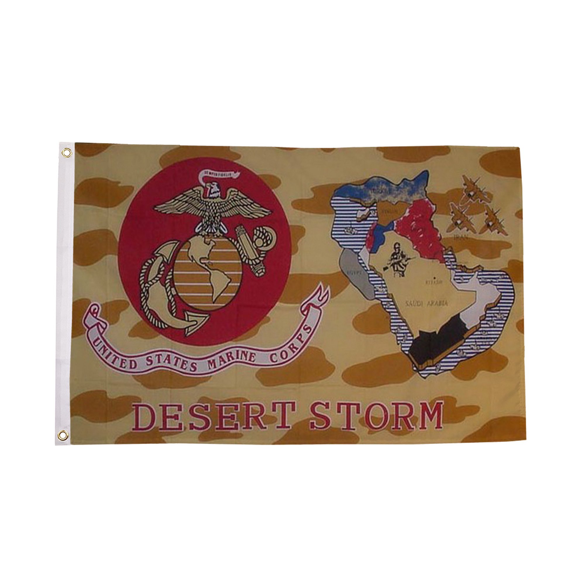 The USMC Desert Storm Flag is a powerful symbol of the bravery and sacrifice of the United States Marine Corps during the Gulf War. Featuring the iconic emblem of the USMC with a backdrop of desert camouflage colors, this flag commemorates the courageous Marines who served in Operation Desert Storm. The flag's design reflects the harsh desert conditions of the conflict, while the bold eagle, globe, and anchor emblem stands as a reminder of the elite fighting force's commitment to freedom and peace. The USMC Desert Storm Flag is not only a tribute to those who served but also a symbol of the Marine Corps' strength, resilience, and unwavering dedication. Made from durable polyester, this flag is built to withstand outdoor conditions, ensuring that it remains vibrant and sharp in all weather. Perfect for collectors, veterans, and those who wish to honor the memory of Desert Storm, the USMC Desert Storm Flag can be displayed at home, at military events, or as part of a commemorative collection.
