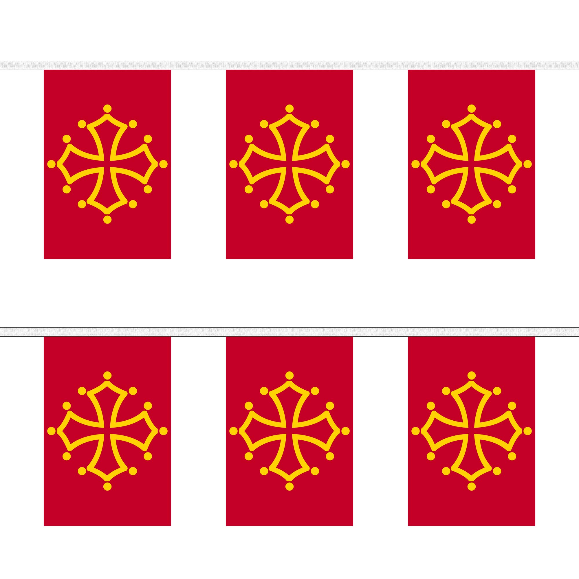 Celebrate the beauty and culture of the Midi-Pyrenees region with our stunning Midi-Pyrenees Rectangular Bunting. Featuring the flag of Midi-Pyrenees, this bunting showcases the bold and vibrant colors that represent the historical and cultural heritage of the region. The flag includes the iconic red and gold design, which symbolizes the region's rich history and its strong ties to the Occitan culture. Perfect for local festivals, regional holidays, or any event honoring this beautiful region of France, this bunting will bring a festive and proud touch to your déor. Made from durable, weather-resistant polyester, it's perfect for both indoor and outdoor use, ensuring your event stays vibrant, rain or shine.