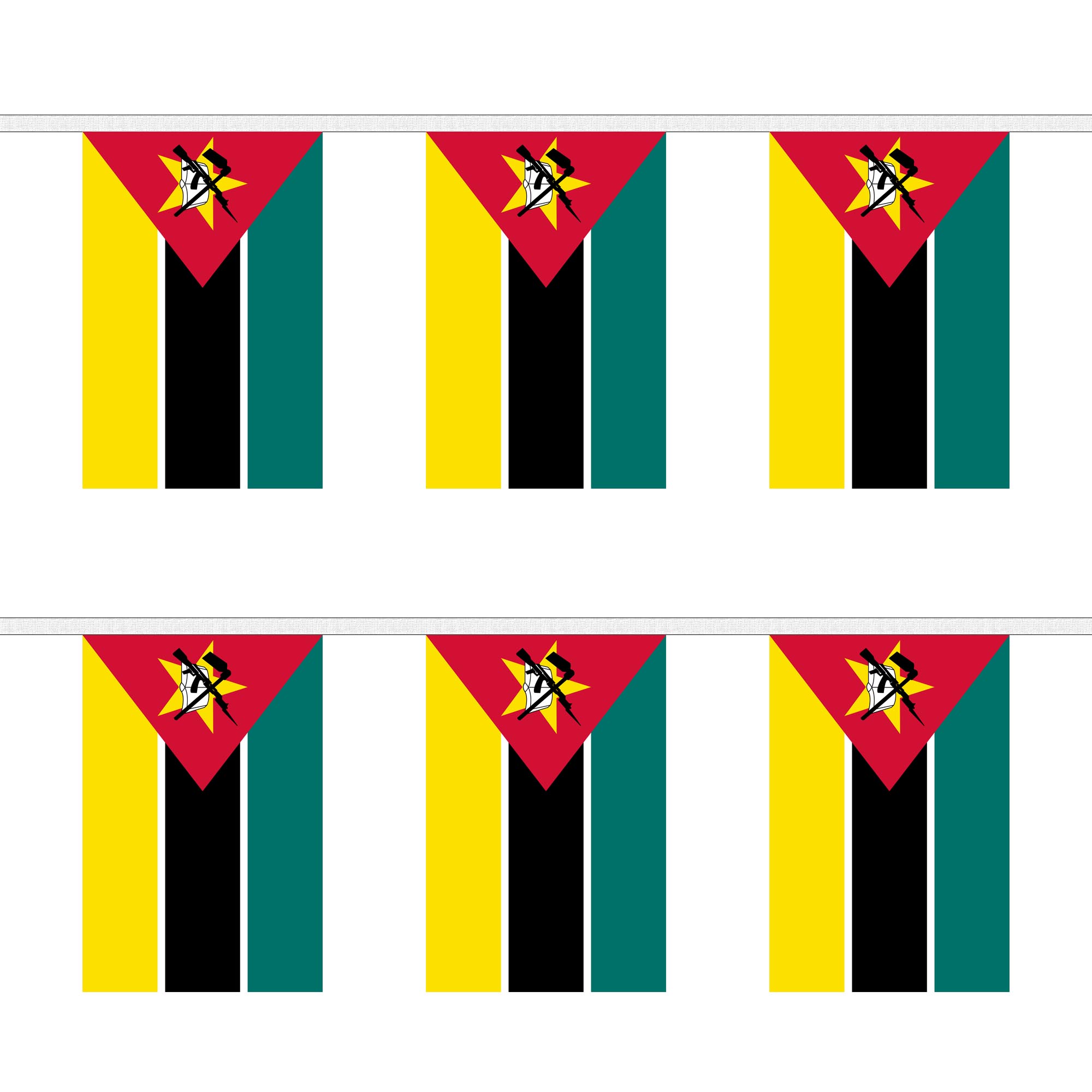Celebrate the vibrant culture and rich history of Mozambique with our stunning Mozambique Rectangular Bunting. Featuring the official flag of Mozambique, this bunting showcases the bold green, black, yellow, and red colors, with a prominent star and an image of an AK-47 rifle and hoe crossed in the center. The flag represents Mozambique's revolutionary history, agricultural strength, and commitment to independence. Perfect for national holidays, cultural events, or any occasion honoring Mozambique, this bunting will add a patriotic and colorful touch to your déor. Made from durable, weather-resistant polyester, it's perfect for both indoor and outdoor use, ensuring your event stays vibrant, rain or shine.