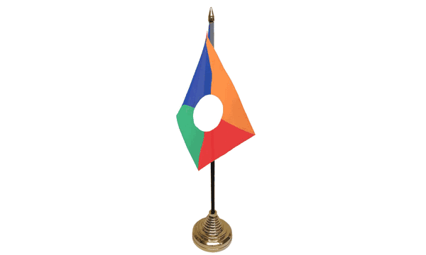 The flag of Reunion Island features a bold and colorful design that represents the island's vibrant culture and natural beauty. The flag consists of four horizontal stripes of blue, red, yellow, and green, with a symbol of a stylized bird in flight, reflecting Reunion's diversity, history, and natural environment. This table flag brings the flag's design into a compact, portable format, perfect for showcasing the pride and cultural identity of Reunion.
