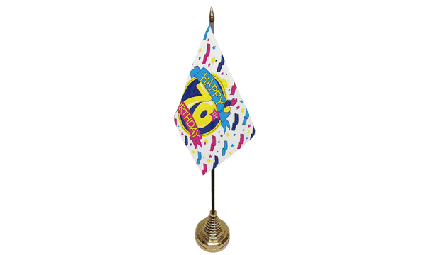 The Happy 70th Birthday flag features a festive design with bright, celebratory elements like balloons, streamers, and the bold "Happy 70th Birthday" message. This flag is designed to honor the special occasion of turning 70, with a cheerful and lively style. Whether it's for a grand birthday celebration or an intimate gathering, this table flag helps create a joyful atmosphere and enhances the party decor.