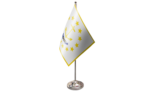 Showcase your pride for the Ocean State with our premium Rhode Island Satin Table Flag. This high-quality satin flag is the perfect choice for celebrating Rhode Island's heritage and history. Crafted from luxurious satin fabric, the flag features a glossy finish that enhances the elegant gold anchor and stars design, which symbolizes Rhode Island's maritime legacy and strong traditions. The premium satin ensures the flag maintains its vibrant appearance, making it a timeless addition to any event, government gathering, or personal collection. Mounted on a durable chrome pole with a sturdy base, ità¢àâ¬àâ¢s easy to display and ideal for a variety of settings.