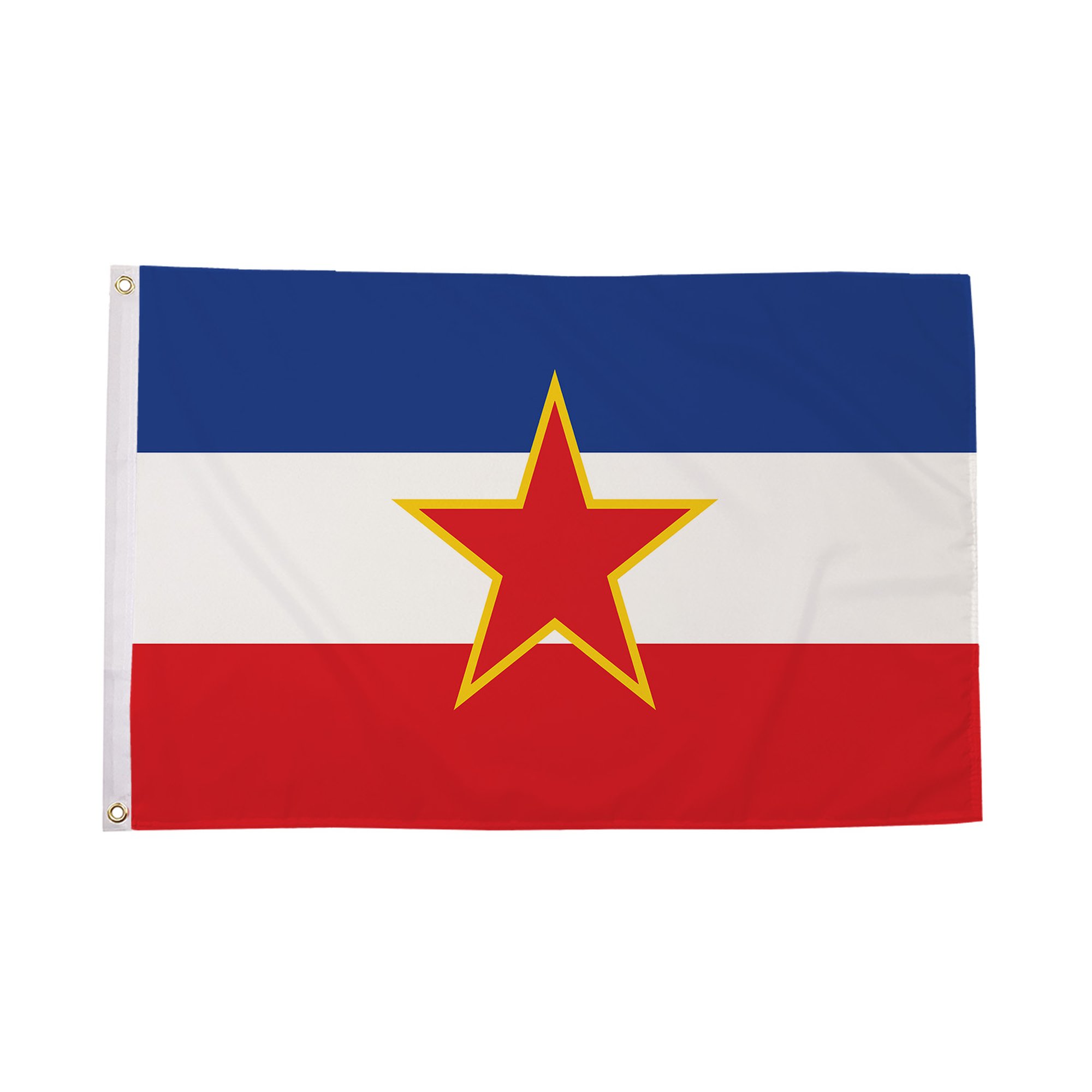 The Yugoslavia With Star Flag is now displayed at historical events, political exhibitions, and museums that focus on the country's socialist past and its impact on the region. It is commonly seen at commemorative events related to the history of Yugoslavia, its people, and the era of socialism in Eastern Europe. The flag is a significant symbol for collectors and historians interested in the political dynamics of the Cold War, the former Yugoslavia, and its influence on European and global affairs. While the flag is no longer used following the breakup of Yugoslavia, it continues to be a symbol of the era and is respected as part of the region's complex history.